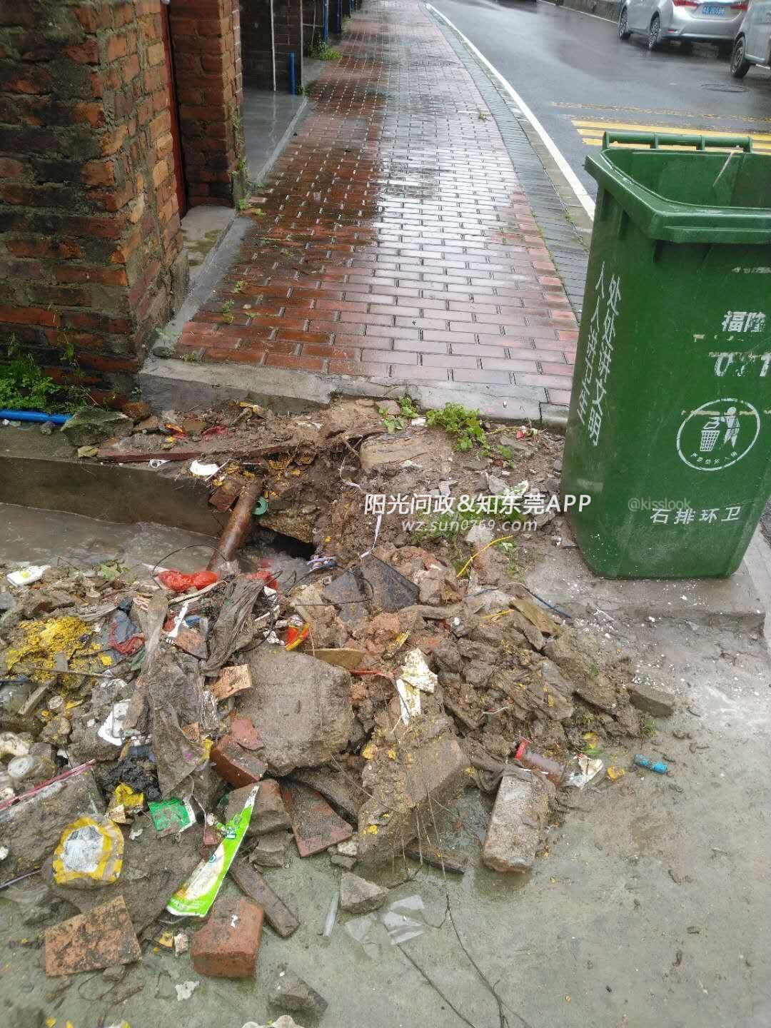 石排福隆下街村下水道堵住,清理出来的垃圾请有关部门处理掉,还有排水口太大,有安全隐患。