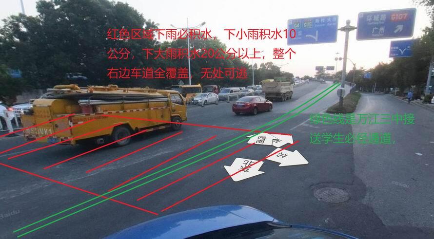泰新路 环城路跨线桥积水 东北向西南方向 如图所示 这里下雨必积水,下小雨积水10公分,下大雨积水20公分,横跨2主道1辅道共3车道,右边引桥往万江三中方向是电动车接送学生必经通道。积水稍深,电动车无法通行;主道机动车车速稍快,激起水花电动车也无法安全通行。 该问题存在几年,一直没彻底解决。现在万江三中扩招,学生多接送家长多。且骑电动车接送都是社会底层民众。 上半年正是雨季,请政府彻底解决此处积水,给电动车子一安全通道。