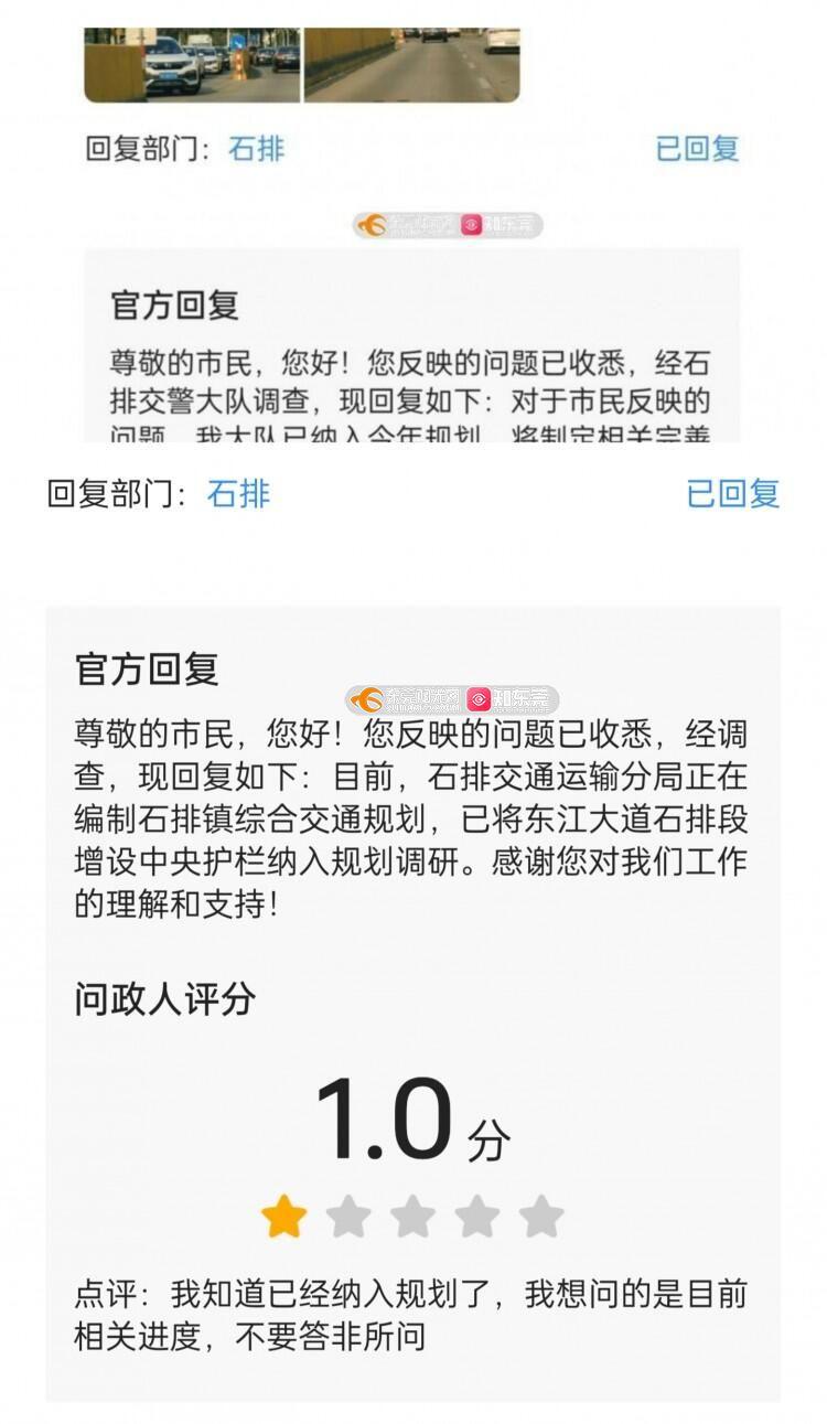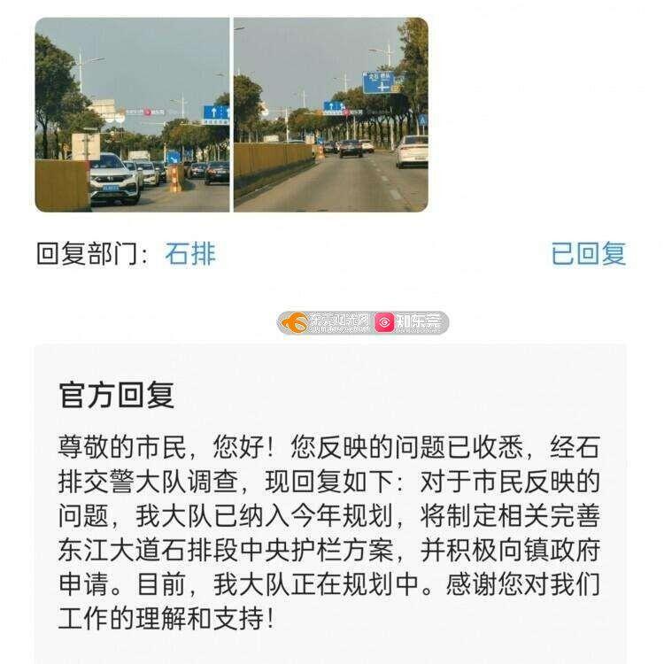 尊敬的市民,您好!您反映的问题已收悉,经石排交通运输分局调查,现回复如下:目前交通运输分局正在制定东江大道等多条道路中央隔离设施完善方案,因近期市交警支队下达相关设施的规范标准,需要对方案进行修改调整。分局将尽快完善措施方案提交上级审议。感谢您对我们工作的理解和支持!