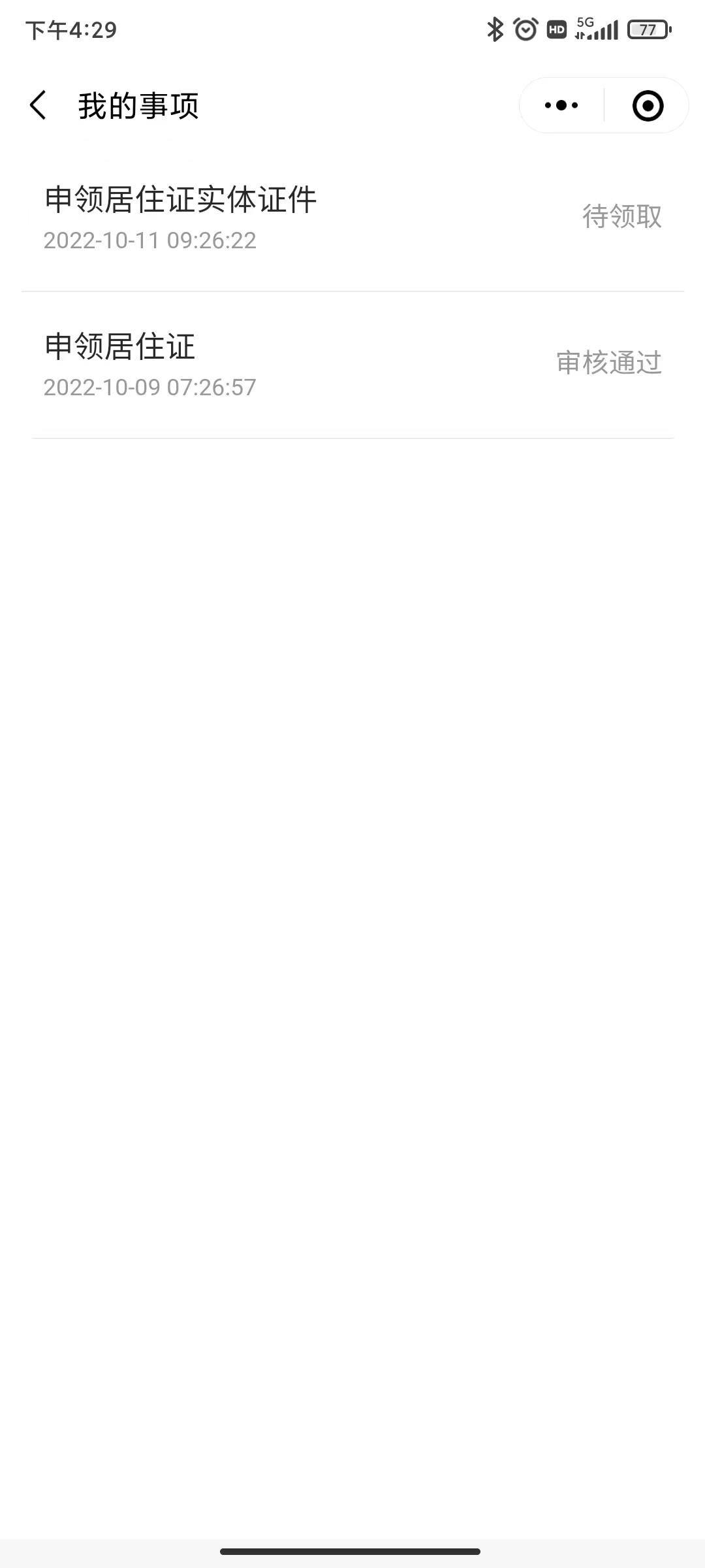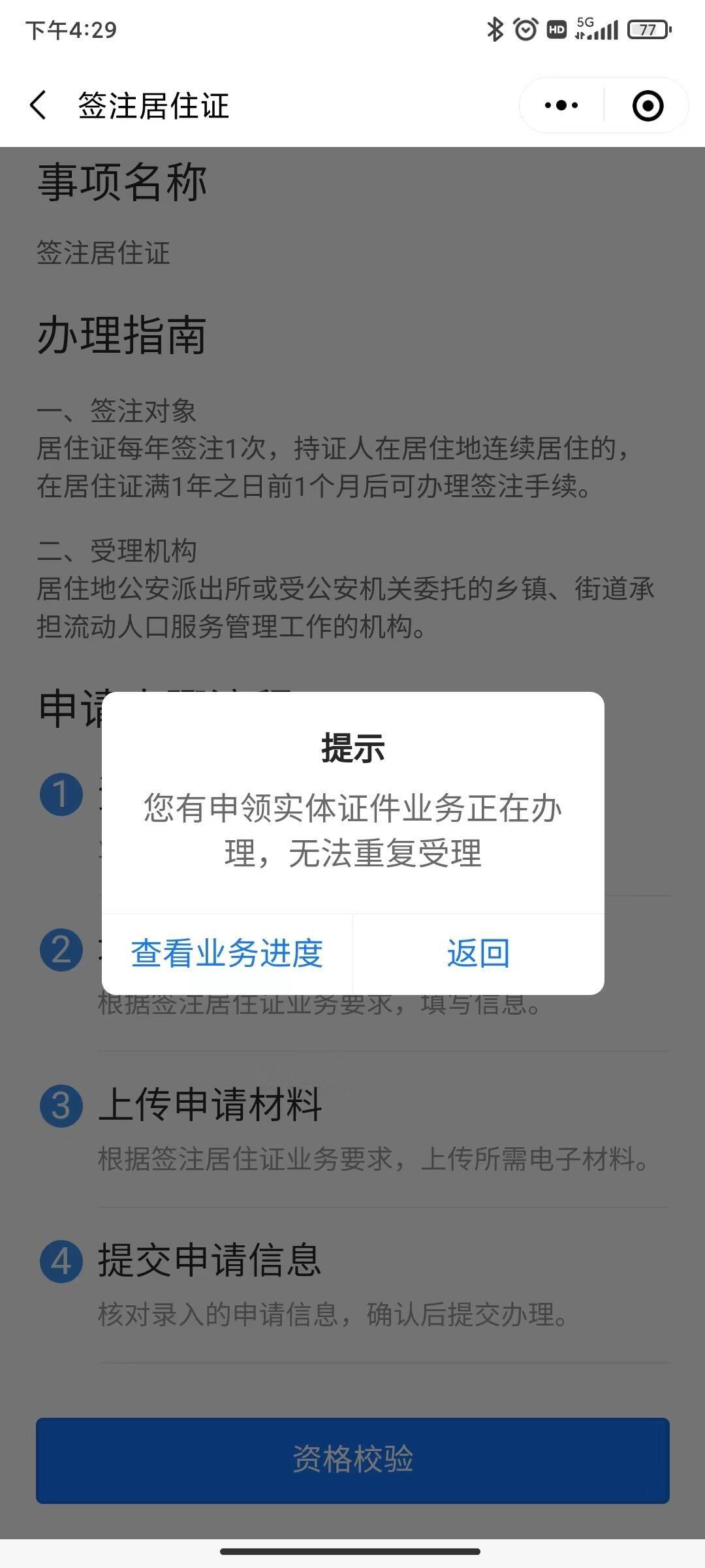居住证快到期需要签注,粤居码执行签注流程时,提示“您有申领实体证件业务正在办理,无法重复受理”。但实际上,申领实体证件业务在将近一年前就已完成,且通过邮寄的方式收到实体居住证证件。粤居码的业务状态始终未更新,导致我无法进行居住证签注业务。