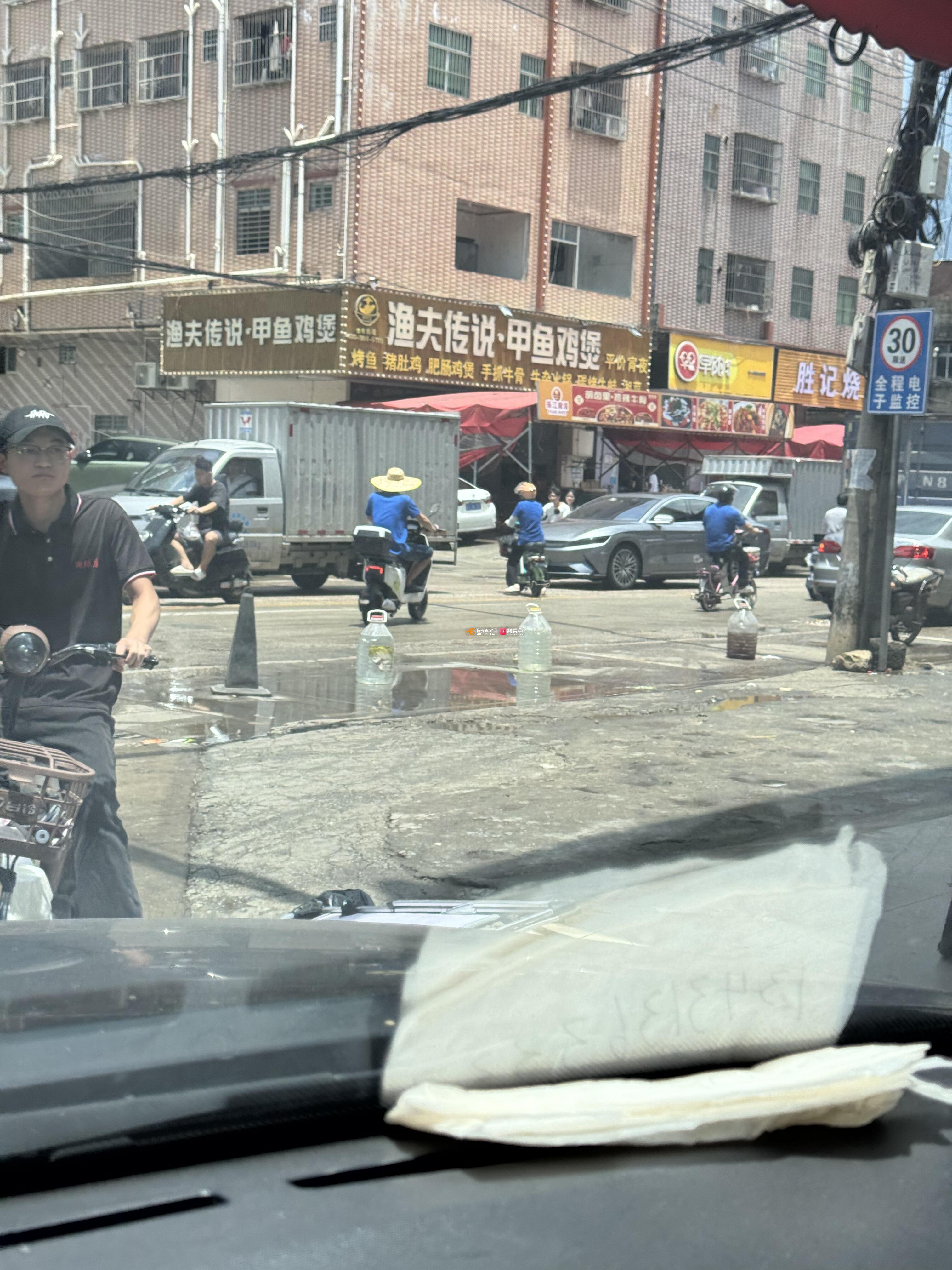 718中午12:00 大兴路 惠客隆便利店门口占用道路 前方也有一台紫色未上牌的小米su7占用道路下板车 造成路面严重拥堵