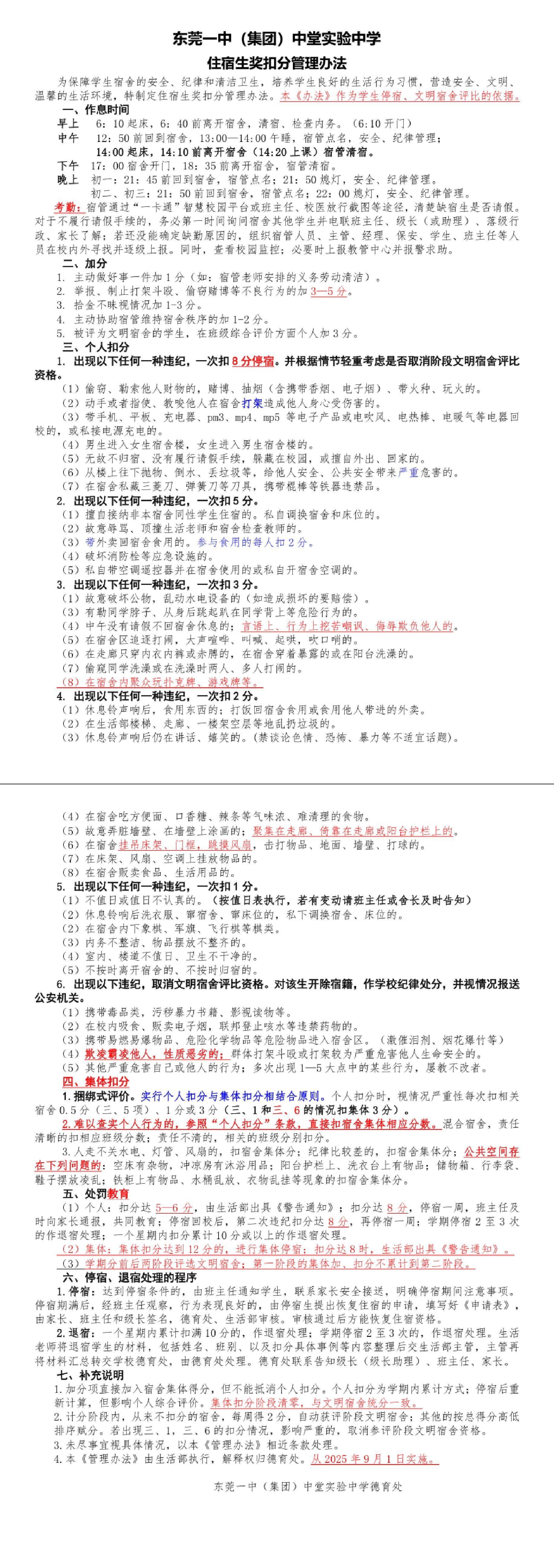 尊敬的市民,您好,您反映的问题已收悉,现回复如下:经了解,中堂镇实验中学是一所寄宿制初中学校,在校住宿学生2200余人,为营造安全安静的生活休息环境,不断养成良好生活习惯,增强集体责任感,学校遵循相关法律法规,在充分听取家长代表、学生代表、全体班主任等群体意见和建议的前提下,参照所有寄宿制学校的做法,经过多轮论证后,于2020年8月底制定了现行的系列管理制度,包括:学生宿舍管理制度(正向指引住宿生行为的制度)、学生宿舍奖扣分制度、学生宿舍安全管理条例、学生宿舍公物使用协议、学生宿舍值日安排制度等,2020年以来,结合实际情况和发展需要,也对相关制度的某些条款作了修改完善。宿舍是全体学生生活场所、休息场所和交往场所,如果没有完善的管理制度,缺乏对违纪行为的必要的合理惩戒措施,是对绝大多数遵规守纪学生合法权益的侵犯。停宿不是目的,而是教育和引导学生更好地融入集体生活,养成良好习惯,不断发展自我。至于扣分多少进行停宿更加合理等问题,学校会在听取更多的意见和建议后,根据实际,如有必要会进行适当调整。若个别学生达到停宿条件,确因家长没办法接送等客观原因,学校也会改用其他方式代替,比如公益性劳动等。如有疑问,可直接联系学校德育处:88122520,或致电教管中心:88111978。感谢您对我们工作的理解和支持。
