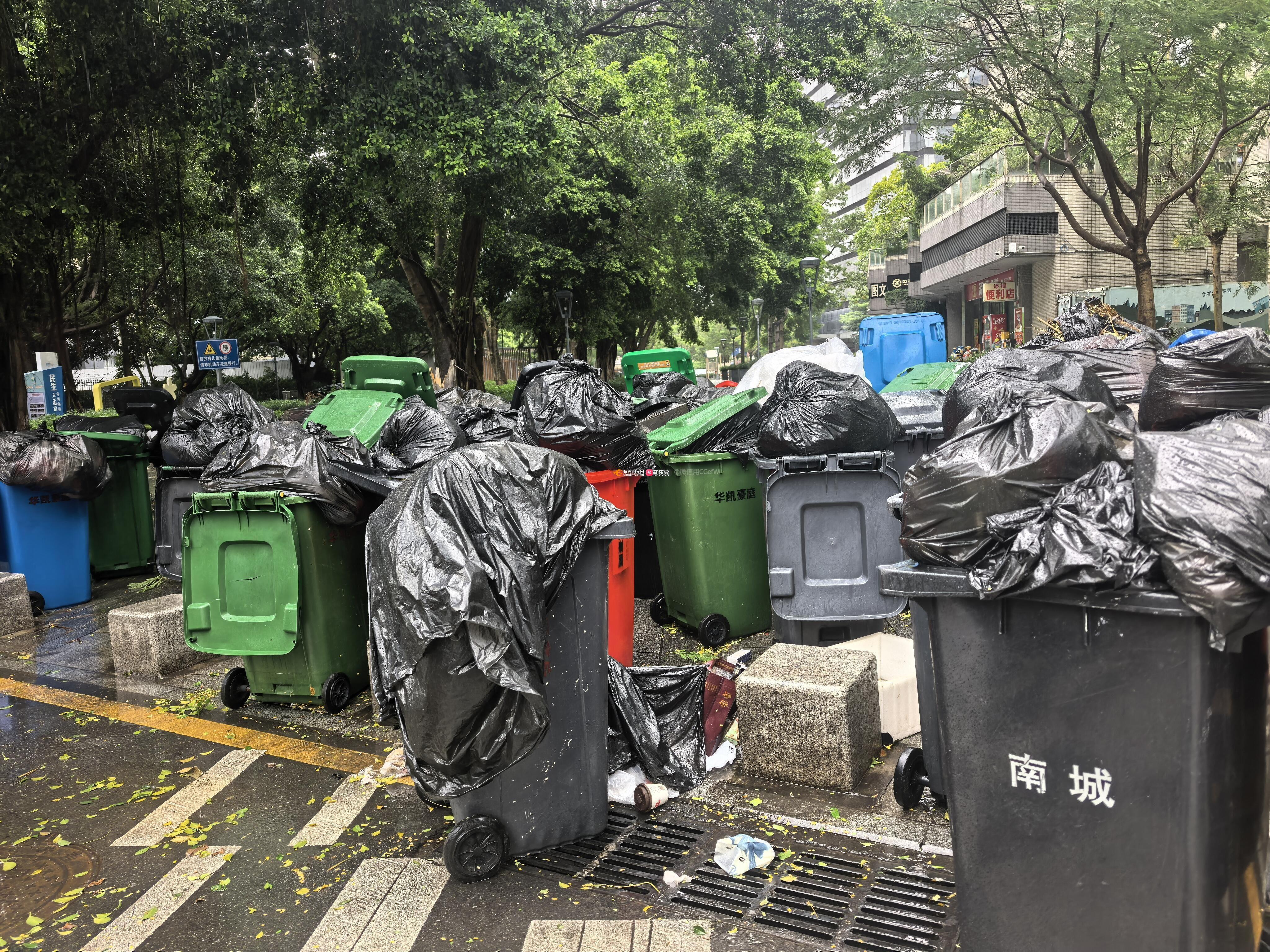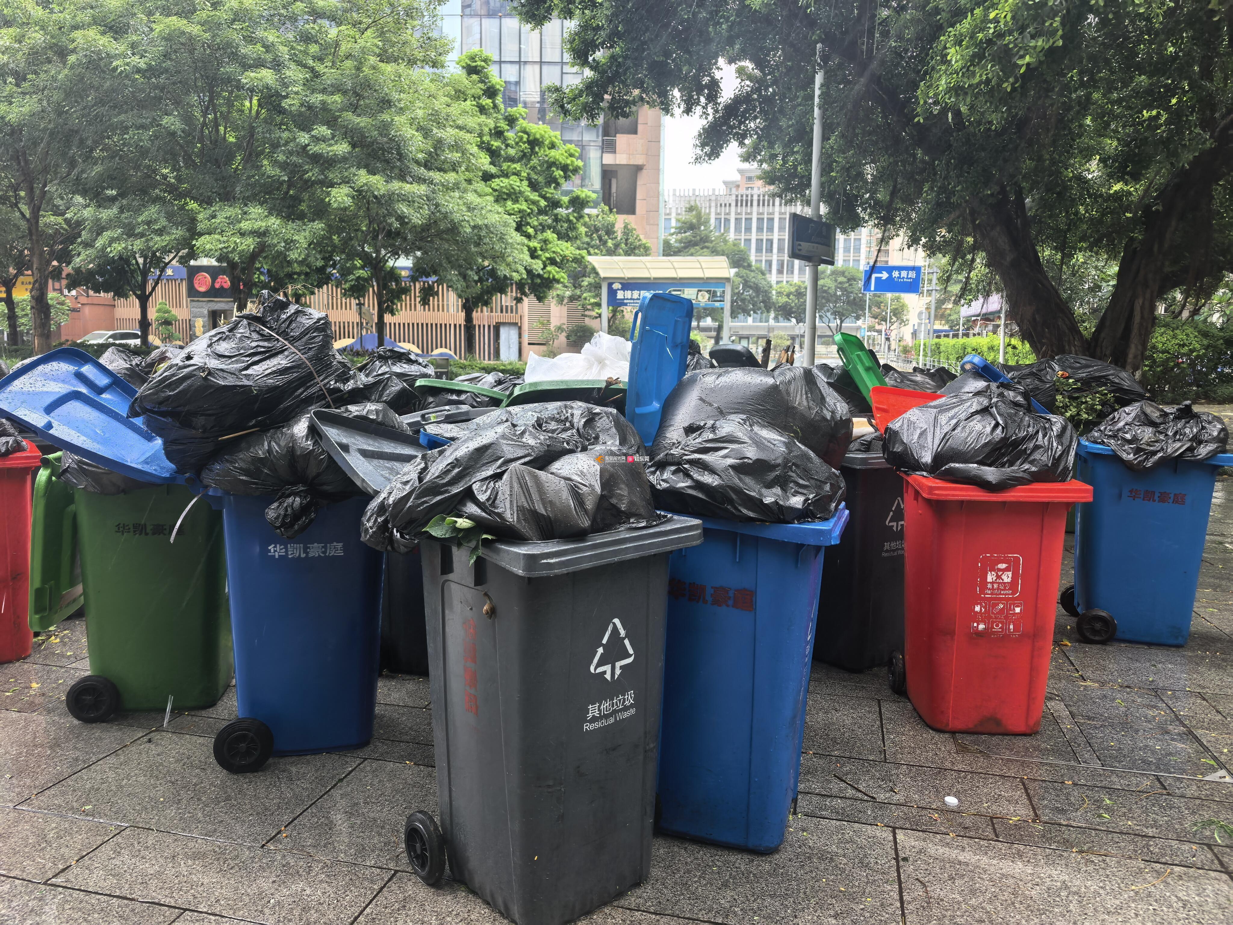 东莞市南城华凯豪庭物业小区垃圾桶乱摆放乱放,臭味散发,严重影响市容市貌
