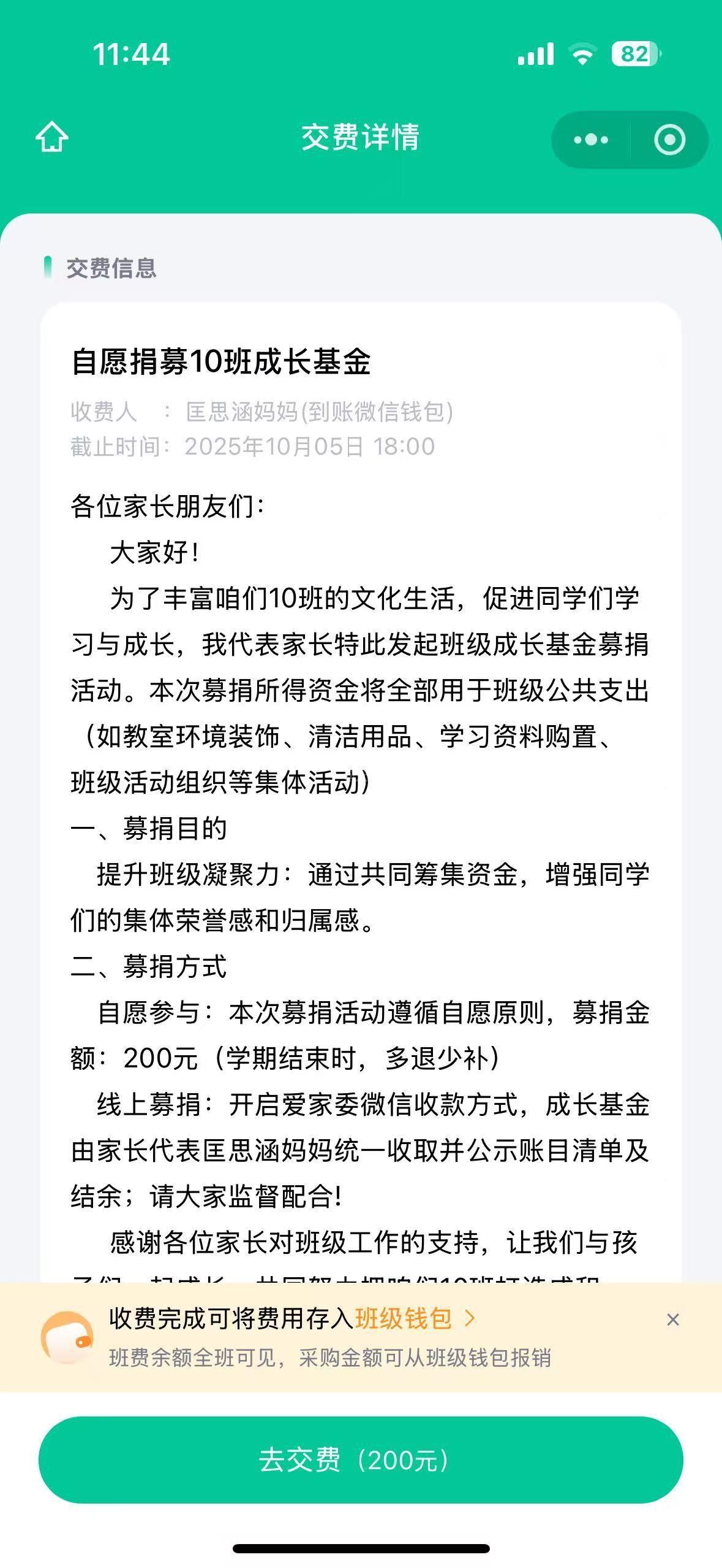 寮步中学初一级家委违规收取班费,家委会以“自愿”原则绑架家长,收取每位学生200元班费。费用也不知道作何种用途,