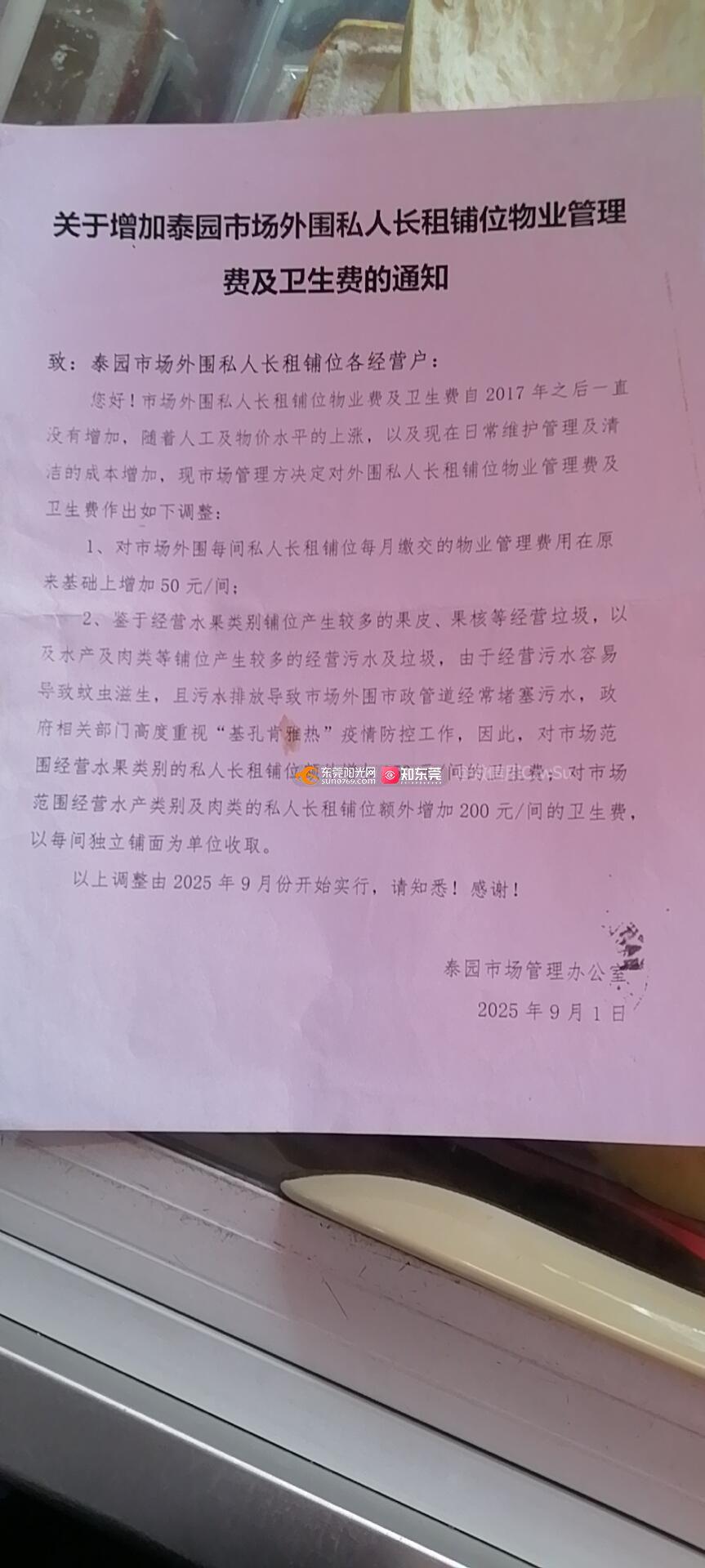 尊敬的上级领导,我们是谢岗镇泰园市场外围商户,十几年来一直都有交管理费(155.元)元,不知是否多收钱?今天又凭一张纸说卖水果的要加收150.元。加收这么多钱是否有相关部门的批准?如若没有,是否属于违法收费?这样无视法律法规,是否应受到严惩?
