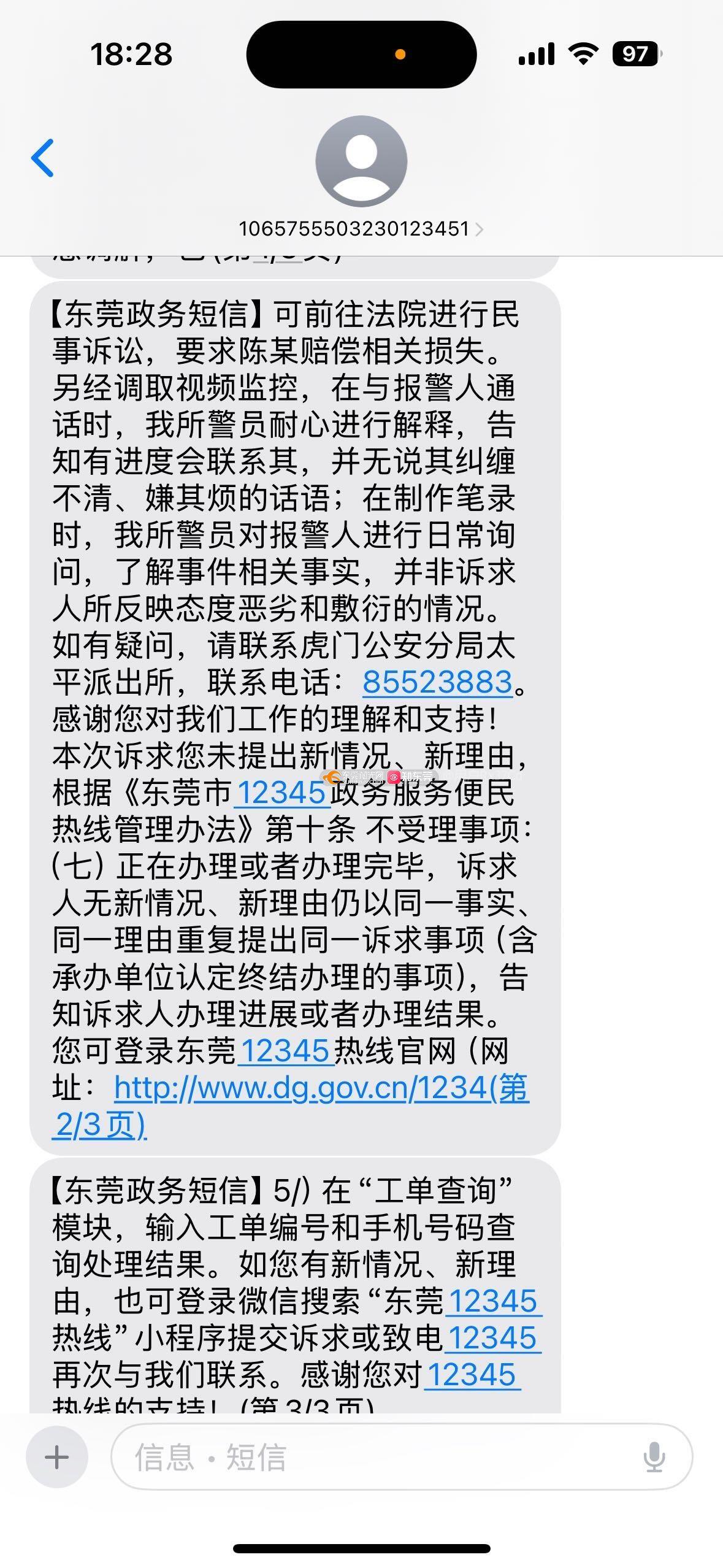 尊敬的市民,您好!您反映的问题,工单编号0825090816063703101,虎门已作出答复,回复意见:经查,8月22日,我太平所接诉求人报称:其车辆被泼辣椒油。据诉求人反映,其当天收到152**08的短信,告知让其移车。因不认识该号码,其便没有理会,返回停车处时,发现车辆被泼辣椒油。我局太平所安排视侦工作人员调取现场监控,并尝试联系涉事人员陈某到派出所协商,但遭陈某拒绝。经核查,该事件属于民事纠纷,我局太平所联系陈某来派出所协商,但遭陈某拒绝,派出所无权强制要求陈某进行调解或赔偿,并非拖延,9月10日晚,经我局太平所坚持不懈地联系,陈某已到派出所反映情况,并表示愿意赔偿诉求人洗车费用,但诉求人暂时不愿意调解,如诉求人不愿意调解,也可前往法院进行民事诉讼,要求陈某赔偿相关损失。另经调取视频监控,在与报警人通话时,我所警员耐心进行解释,告知有进度会联系其,并无说其纠缠不清、嫌其烦的话语;在制作笔录时,我所警员对报警人进行日常询问,了解事件相关事实,并非诉求人所反映态度恶劣和敷衍的情况。如有疑问,请联系虎门公安分局太平派出所,联系电话:85523883。本次诉求您未提出新情况、新理由,根据《东莞市政务服务便民热线管理办法》第十条 不受理事项:(七)正在办理或者办理完毕,诉求人无新情况、新理由仍以同一事实、同一理由重复提出同一诉求事项(含承办单位认定终结办理的事项),告知诉求人办理进展或者办理结果。
