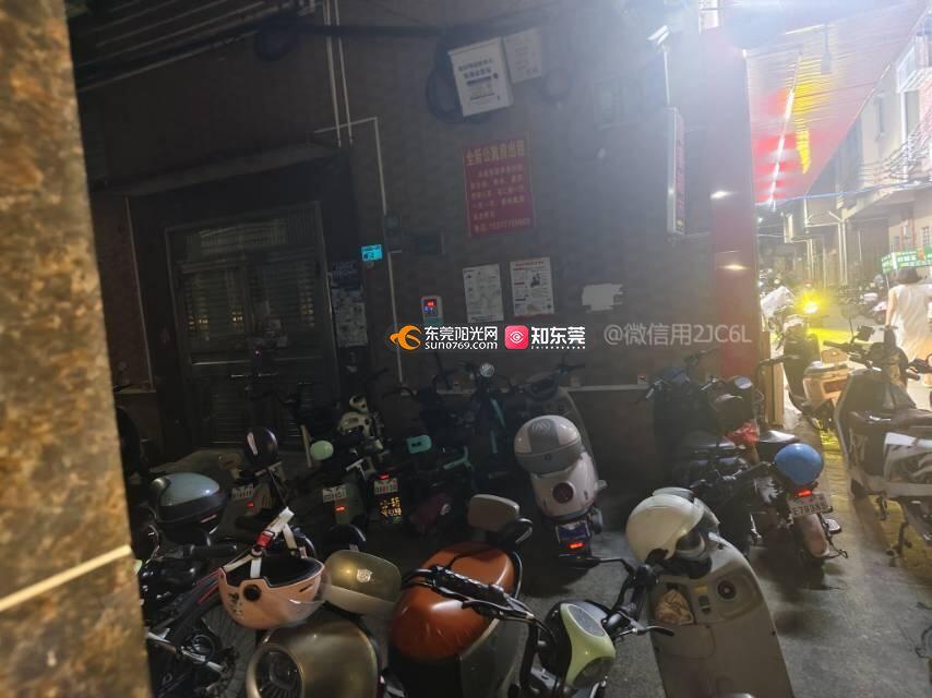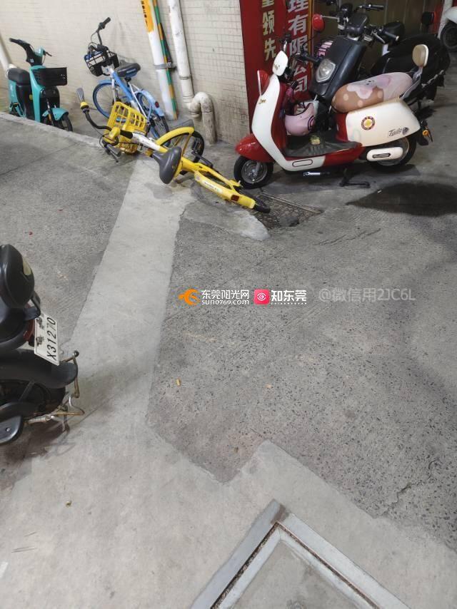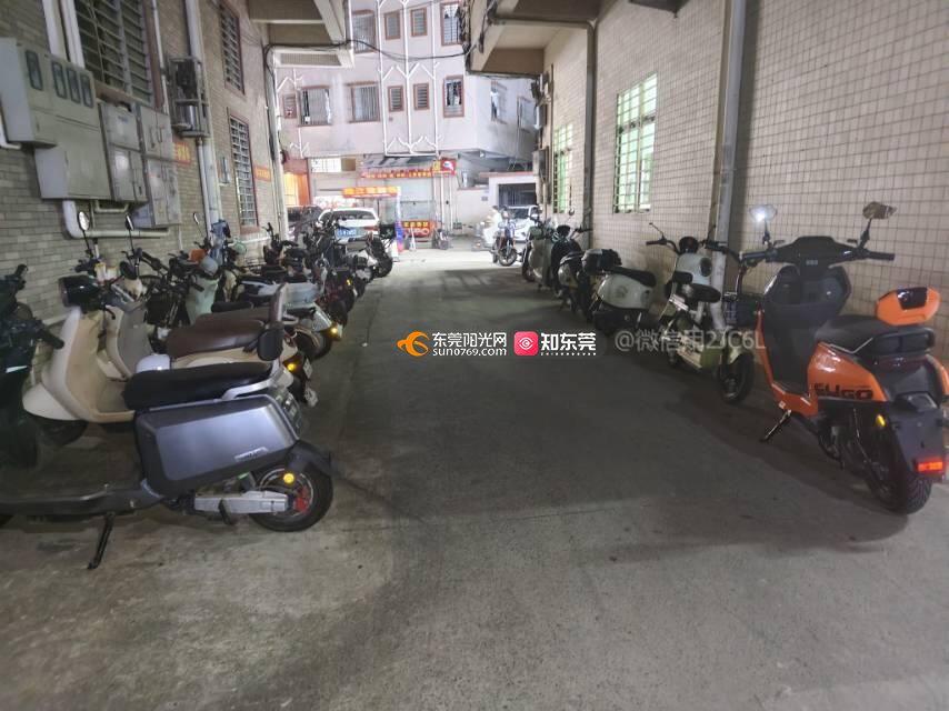位于东莞市虎门镇赤岗西坊新区15巷附近的电动车停车非常混乱,共享单车随地乱放