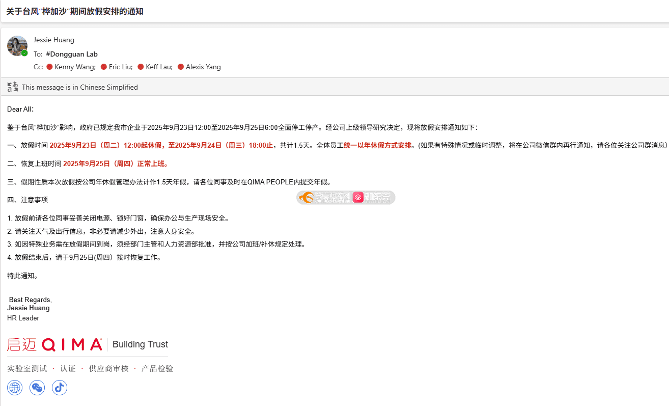 寮步镇长坑村长圣路6号办公楼A栋,启迈检测(东莞)有限公司,该企业在9月22日发邮件通知员工强制用带薪年休假冲抵9月23-至9月24日东莞市要求的台风桦加沙停工,没有带薪年休假的被要求在9月27日补班或扣9月23日至9月24日停工期间的工资。图片是该企业通知的邮件截图,望有关部门核查,谢谢。