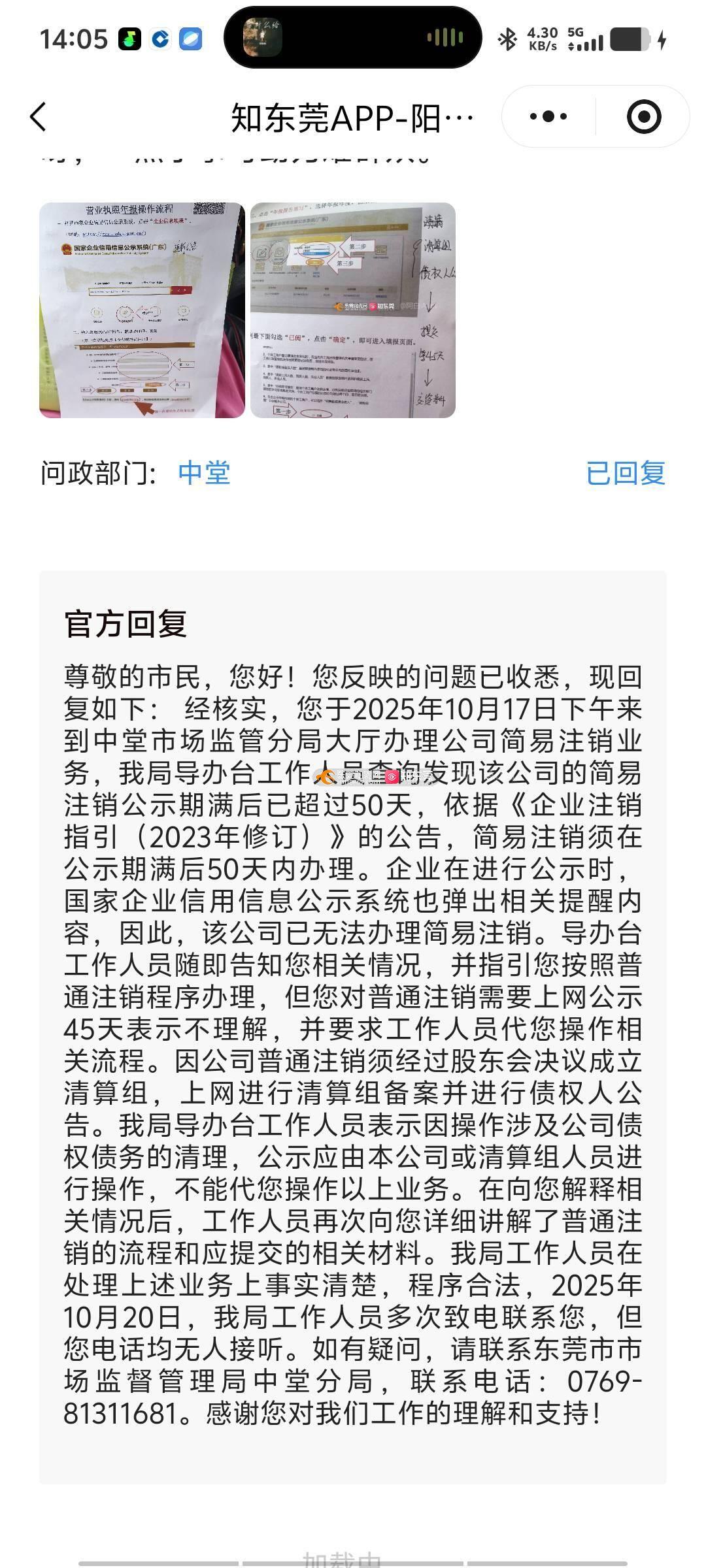 中堂市场监督管理官方果然很官方!!!上一个投诉官方回复,第一,我没有接到你们的任何电话,查过手机也没有任何未接电话,拦截名单也没有!第二,上一个投诉回复我说是简易注销需要在50天内办理,9.17号下午我到中市场监督管理局大堂给我一份企业注销登记申请书,让我做公告,还写了一个小纸条(简易注销公告)满30天再去盖章。如果现在超过50天,那么9.17号去的时候没有超过50天为什么还要我去做简易注销公告???回答我。
