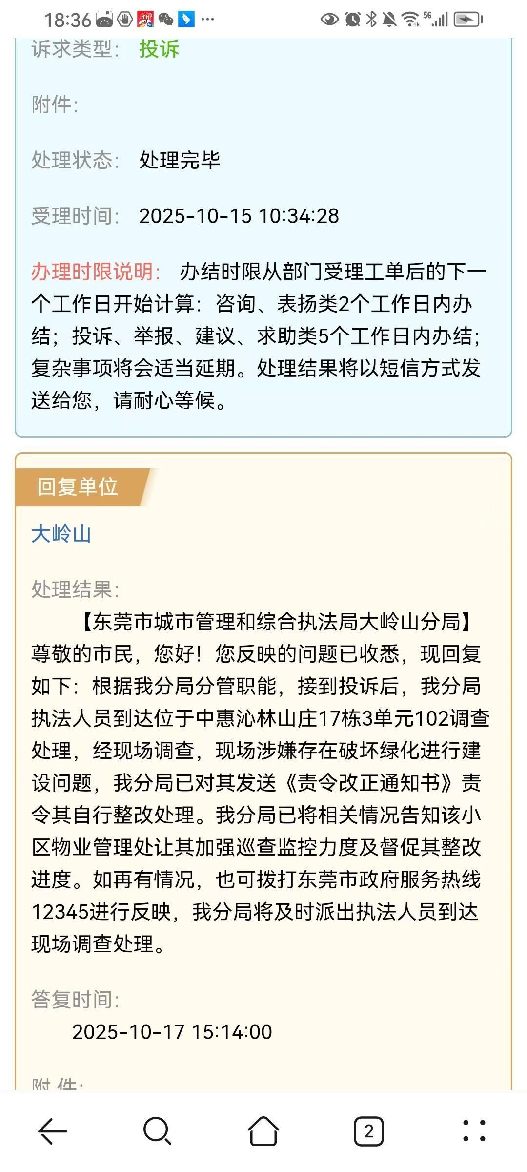 大岭山镇杨屋村中惠沁林山庄17栋3单元102住户,私自占用小区绿化带,修建个人庭院,砍伐门前绿化树木,破坏小区绿化。且物业公司不但不阻止,还帮业违法行为掩护(将砍伐树木描述为灭蚊行为,但对占地行为视为不见)。2025年10月15日,已有正义邻居向12345投诉反馈,大岭山城管局派人来查勘后给违法行为下发了整改通知,但是让其自行整改,且让物业公司监督。物业本身就跟违法者串通一气,怎么监督?该整改通知没起到丝毫作用。一个星期过去了,不但没有整改,该业主还在违法侵占的院子里摆起了装饰绿化。 请上级部门加严执法: 1、明示整改期限,并告知拒不整改或逾期不整改的处罚措施 2、请执法部门后续继续跟进整改进度,而不是让物业公司来监督,有走过程嫌疑 3、请上级部门对执法队伍进行监督和考核