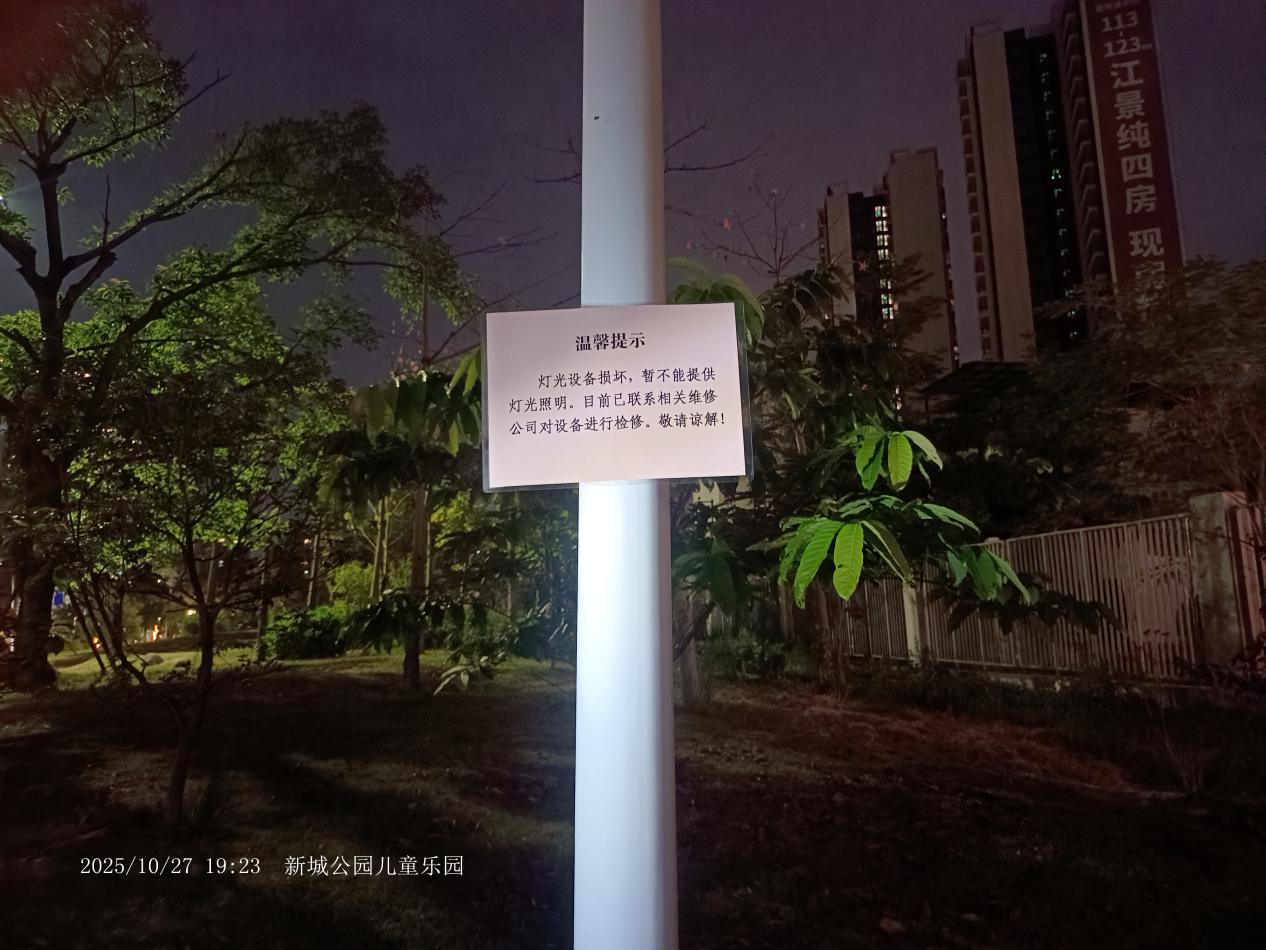 尊敬的市民,您好!您反映的问题已收悉,现回复如下:近期,茶山镇宣教文体旅游办在日常巡查中发现,新城公园儿童公园内秋千、滑梯、灯光等设施出现损坏情况。发现问题后,工作人员第一时间联系专业维修公司对相关设施开展现场勘察,并在公园显著位置张贴《温馨提示》,明确告知市民设施损坏情况。经研究决定,计划对已损坏的设施进行维修。目前,相关维修方案正处于制定阶段。针对儿童跑泡泡车乱摆乱放问题,工作人员已联系投放公司,该公司负责人回应将在近期完成全部儿童泡泡车的回收工作。2025年10月28日下午15:40分,工作人员致电给您,并告知相关情况。下一步,茶山镇宣教文体旅游办将加快推进维修方案完善与施工落地工作,力争在2025年12月底前完成维修,恢复设施的正常使用,为市民营造安全、稳定、便捷的休闲运动环境。如有疑问,请联系茶山镇宣教文体旅游办,联系电话:82667036。感谢您对我们工作的理解和支持!
