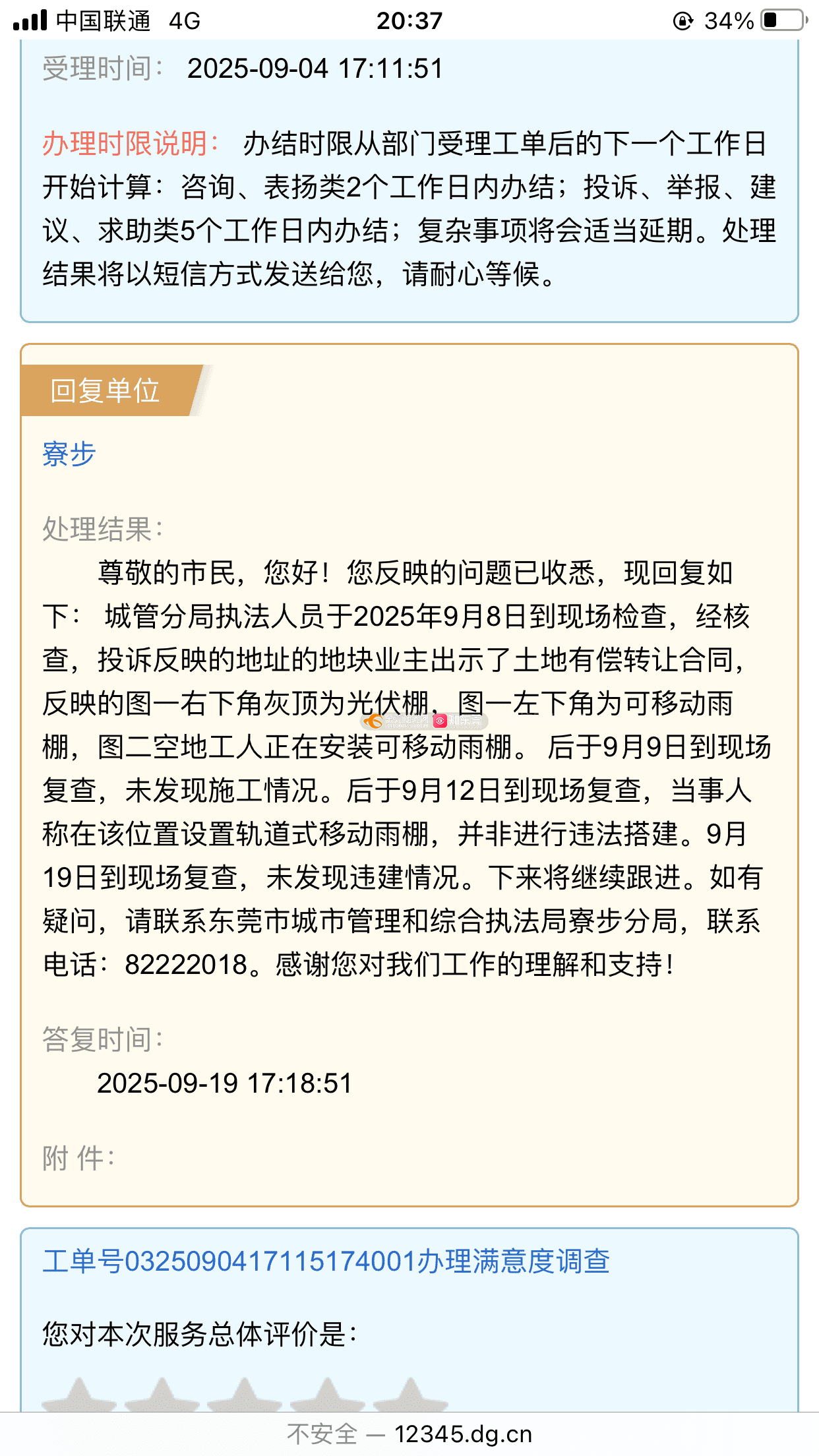 9月4日在12345热线反应寮步镇西溪村芦溪二路30号违建搭棚(附有现场多角度相片),寮步城市综合管理局9月17日调查回复结果两处并非违建分别一处光伏顶另一处是轨道移动雨棚。调查结果与现场实况颠倒 9月27日再次在12345热线反应该址违建搭棚并提交更多实地取证相片到贵局,10月15日方作出结果是违建及责令自行恢复原貌和拆除。本人在回访不满意原因描述栏里填写如下: 9月4日反应上述情况,9月17日调查结果颠倒蓄意庇护违建搭棚,9月20日经过反应人两次实地取证提交贵局,10月15日方作出结果是违建及责令自行恢复原貌和拆除,责令自行恢复和拆除也没有标出责令限期。这种执法程序是忽悠百姓都还是有执法人员包庇 10月23日翻阅贵局在10月15日调查回复内容,己被贵局变改为9月17的调查内容,调查回复内容告知市民后也能随意改动!?