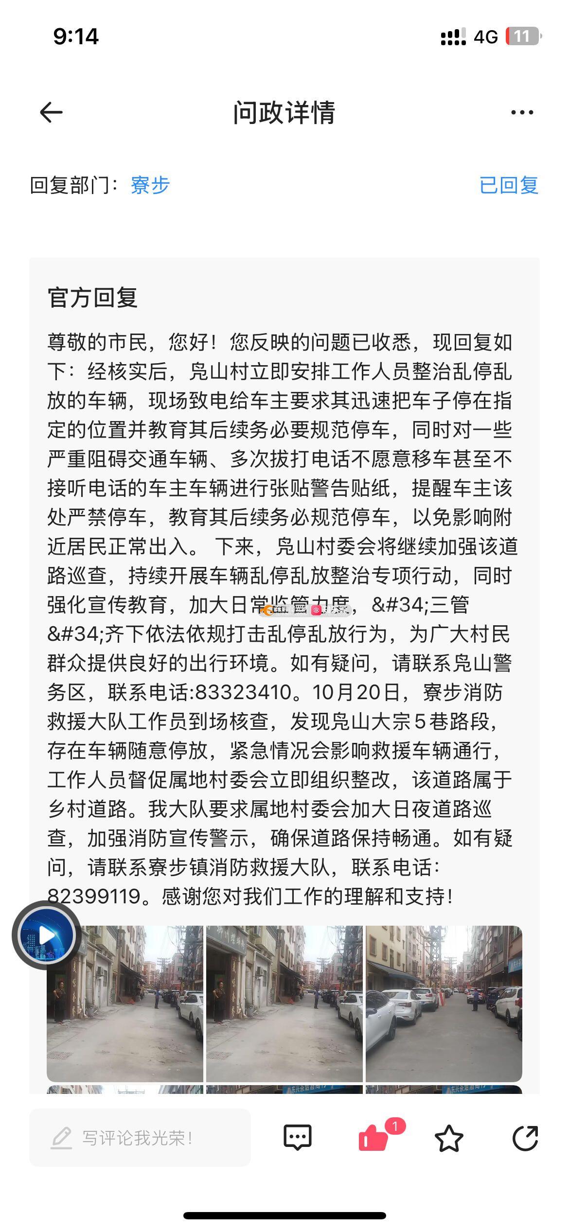 尊敬的领导: 您好!我是寮步凫山村民,此次前来是想反映村里狭窄道路违规停车,妨碍消防通道的严重问题。 随着生活水平提高,村里车辆日益增多,但停车管理却严重滞后。狭窄道路两侧随意停放着各种车辆,导致道路更加逼仄。而这些违规停放的车辆,已让消防通道名存实亡 。一旦发生火灾等紧急情况,消防车根本无法及时抵达现场,村民的生命财产安全将遭受巨大威胁。 此前,村里也曾发生过因车辆乱停,车主争吵,虽然看起来小事,但这无疑为我们敲响了警钟。所以,希望相关部门能尽快采取行动,如设置禁停标识、恢复实行停车收费等。因为之前停车收费,一边道路只能单方向行驶,不会出现这个问题! 另外。此前反映后,虽有整治行动,但至少整改的第一天,但现状依旧,这暴露了村委巡查员的不作为。违规车辆长期占用通道,巡查员却未及时发现、劝离,也未有效落实长效监管,导致问题反复。 消防通道是生命通道,一旦发生火灾,后果不堪设想。恳请领导督促村委加强巡查力度,对巡查员不作为行为严肃问责,希望凫山村委彻底解决违规停车问题,保障村民生命财产安全。 感谢领导聆听,期待问题早日解决。
