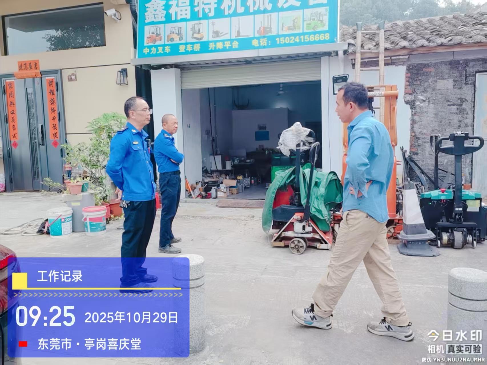 东莞市东坑镇彭屋亭岗村寮东路182好鑫福特机械设备,存在多种违规行为,多次城管村委过去教育并未得到整改,说自己并没有违规,不知道是普法不到位还是阳奉阴违!占道经营,这边放过那边,放来放去还是没有撤走,都是影响安全和村容村貌,此商铺是销售和租赁特种设备,并不符合不具备维修条件,场地更加不能满足,而店铺老板随地维修,遗留的零件随意丢弃,地面到处残留机油,难看之余最主要影响安全,两轮车压过的一定打滑,地面的油迹一直都有,脏乱差,门前三包也根本没做到还祸害周边环境卫生安全;叉车违规上路,随意路边维修,完全不把安全放心上,车辆随意停放,增加盲区,毫无安全意识!路过的道路参与者都十分危险,由于盲区影响经过的车辆经常鸣笛,十分影响!这样的人到哪哪危险,对于严格遵守重视安全的我们是绝对不能容忍,事故出于麻痹大意!还有这里的房子存在违规盖棚,还未整改!