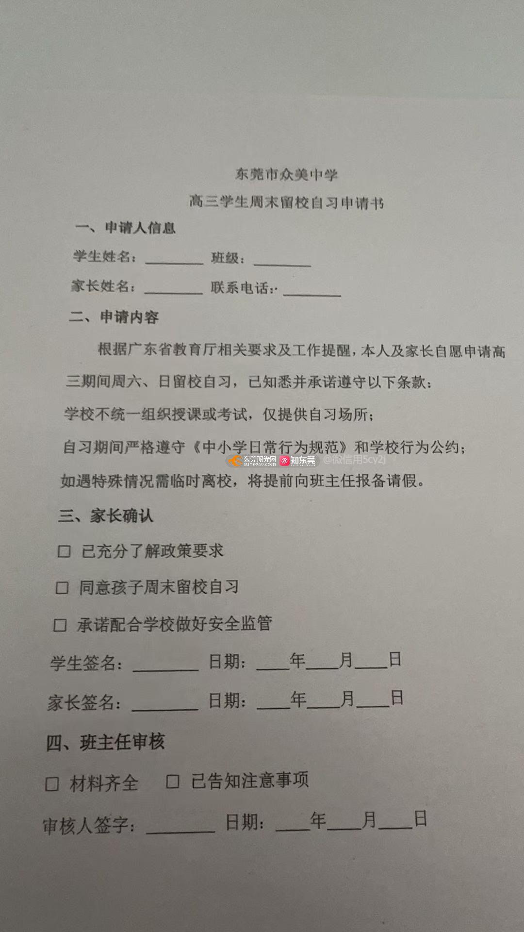 东莞市众美中学要求学生签订周末“自愿”留校协议