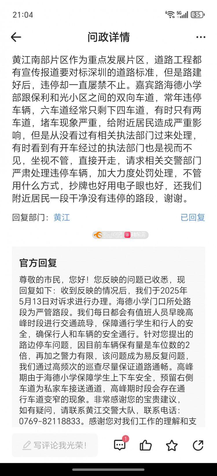 尊敬的市民,您好!您反映的问题已收悉,现回复如下:收到反映的情况后,我们于2025年11月1日对诉求进行办理。我队表示对于该地方乱停车辆,已经派出警员前往现场处理,并对违停车辆进行处罚,接下来我队也会继续加强对该段道路的违停查处,保证群众的出行安全。如有疑问,请联系黄江交管大队,联系电话:0769-82118833。感谢您对我们工作的理解和支持!