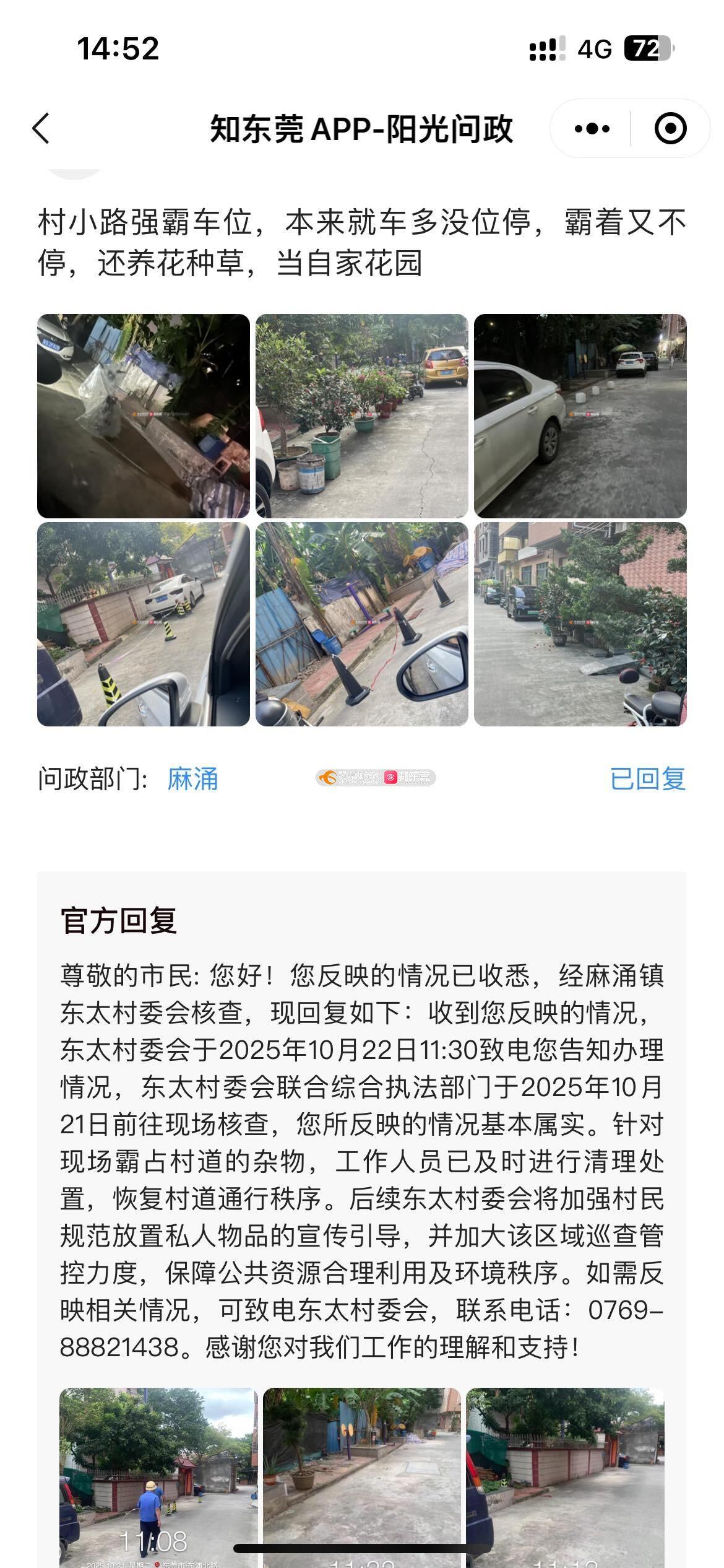 尊敬的市民,您好!您反映的问题,工单编号28101710510453201,麻涌已作出答复,回复意见:收到您反映的情况,东太村委会于2025年10月22日11:30致电您告知办理情况,东太村委会联合综合执法部门于2025年10月21日前往现场核查,您所反映的情况基本属实。针对现场霸占村道的杂物,工作人员已及时进行清理处置,恢复村道通行秩序。后续东太村委会将加强村民规范放置私人物品的宣传引导,并加大该区域巡查管控力度,保障公共资源合理利用及环境秩序。如需反映相关情况,可致电东太村委会,联系电话:0769-88821438。本次诉求您未提出新情况、新理由,根据《东莞市政务服务便民热线管理办法》第十条 不受理事项:(七)正在办理或者办理完毕,诉求人无新情况、新理由仍以同一事实、同一理由重复提出同一诉求事项(含承办单位认定终结办理的事项),告知诉求人办理进展或者办理结果。
