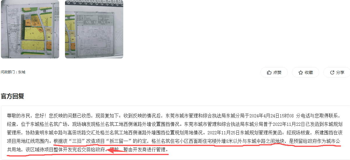 尊敬的市民,您好!您反映的问题已收悉,现回复如下:收到反映的情况后,我分局于2025年10月31日 16时42分电话与您取得联系,并于2025年11月03日10时10分对诉求进行办理。经查,位于东城格兰名筑,现场确实发现格兰名筑工地西侧道路外墙设置围挡情况。此前我分局曾发函到东城规划管理所,协助查明东城中路与高田坊路交汇处格兰名筑工地西侧道路外墙围挡位置规划用地情况。根据东城规划管理所复函:经现场核查,所建围挡在该项目用地红线范围内。根据该“三旧”改造项目“拆三留一”的约定,格兰名筑住宅小区西面距住宅楼外墙8米以外与东城中路之间地块,是预留给政府作为城市公共用地,该区域待项目整体开发完后交回给政府。如有疑问,请联系东莞市城市管理和综合执法局东城分局,联系电话:22001982。感谢您对我们工作的理解和支持!(东莞市城市管理和综合执法局东城分局) 2025年11月5日