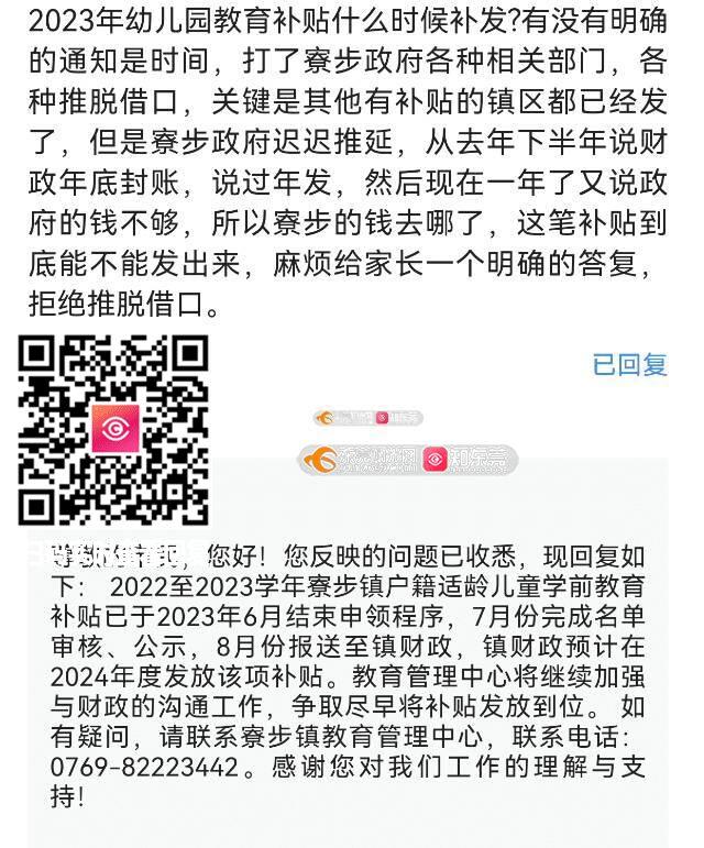 尊敬的市民,您好!您反映的问题已收悉,现回复如下: 由于目前镇财政资金较为紧张,2022至2023学年寮步镇户籍适龄儿童学前教育补贴待资金到位后再进行拨付,目前暂无法确定发放时间。教育管理中心将继续加强与镇财政的沟通工作,争取尽早将补贴发放到位。 如有疑问,请联系寮步镇教育管理中心,联系电话:0769-82223442。感谢您对我们工作的理解与支持!