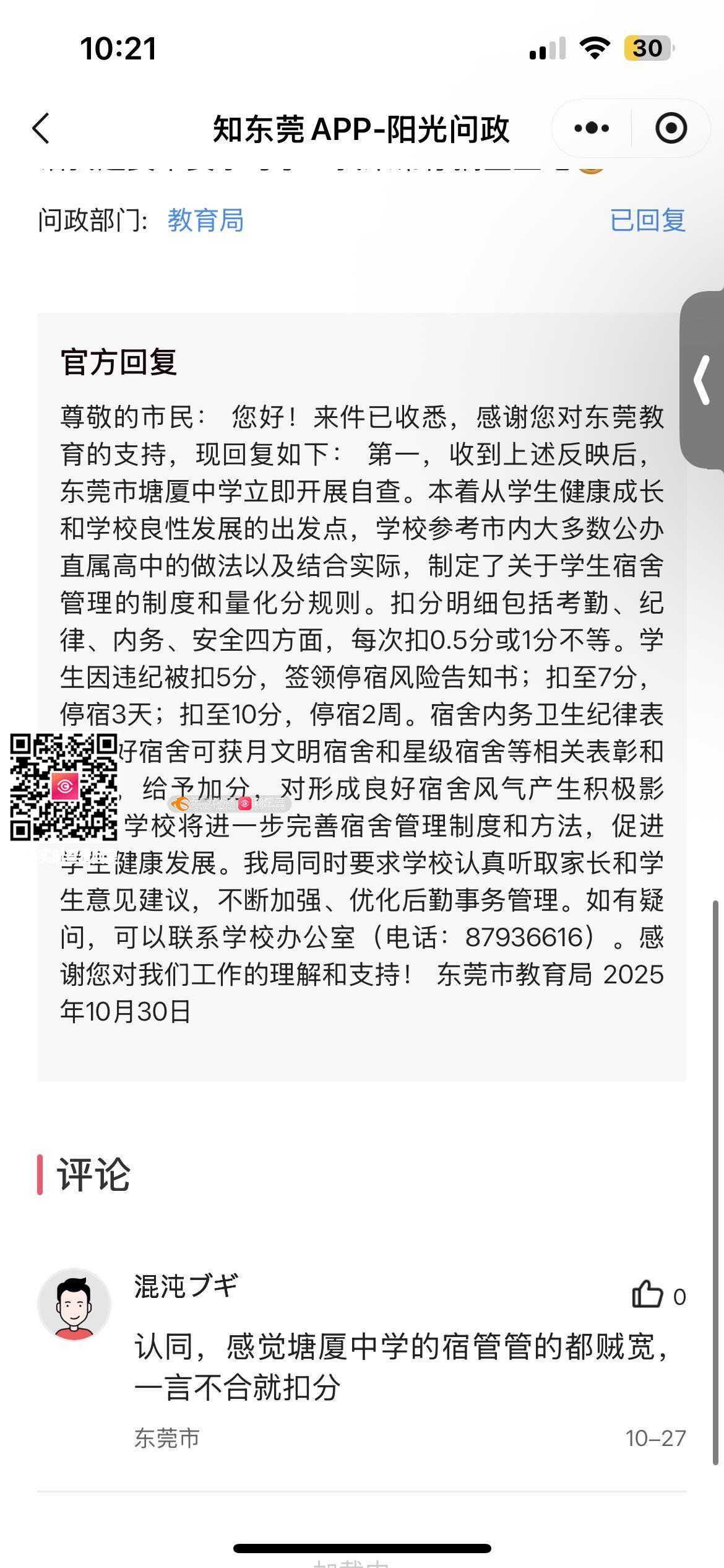 那些条例只是说的好听但实际上我们学生感受是什么 和实际相同吗?加分真的一点都不容易 但扣分却是整天整天的扣 我觉得倒垃圾扫地折被子也是合理晚上不得讲话扣分也是为了让我们睡好觉 这是人之常情我理解也赞同 但是这些小事学校会发大 那个被子要垫超级平 但是我的被子的棉絮不平难以折好 阿姨自己也试着折也说不好折 那为什么还要扣我被子的分?这不是折了吗 还要按要求折三叠 光是折被子就要花费一两分钟了 这个时间我都可以刷了牙然后早早回教室了 这个要求折几下还要平整的规矩实在太多余我们是来学习不好搞卫生 这周有家长来调查学校 我一看那个扣分表都少了几页 真的是太可笑了 我喜欢学校的宿舍规矩可以改松一点 规矩是死的 人是活的 学生是来学习的不是来读书的 因为这个宿舍乱扣分搞的学生心情不好 7分回家合理吗😂人是活的阿姨想扣多少分就扣多少分你觉得说扣那点0.8分我会问政吗 你们像下面图片这样回复也无用 学校无改进 那我这个问政的意义在哪里?