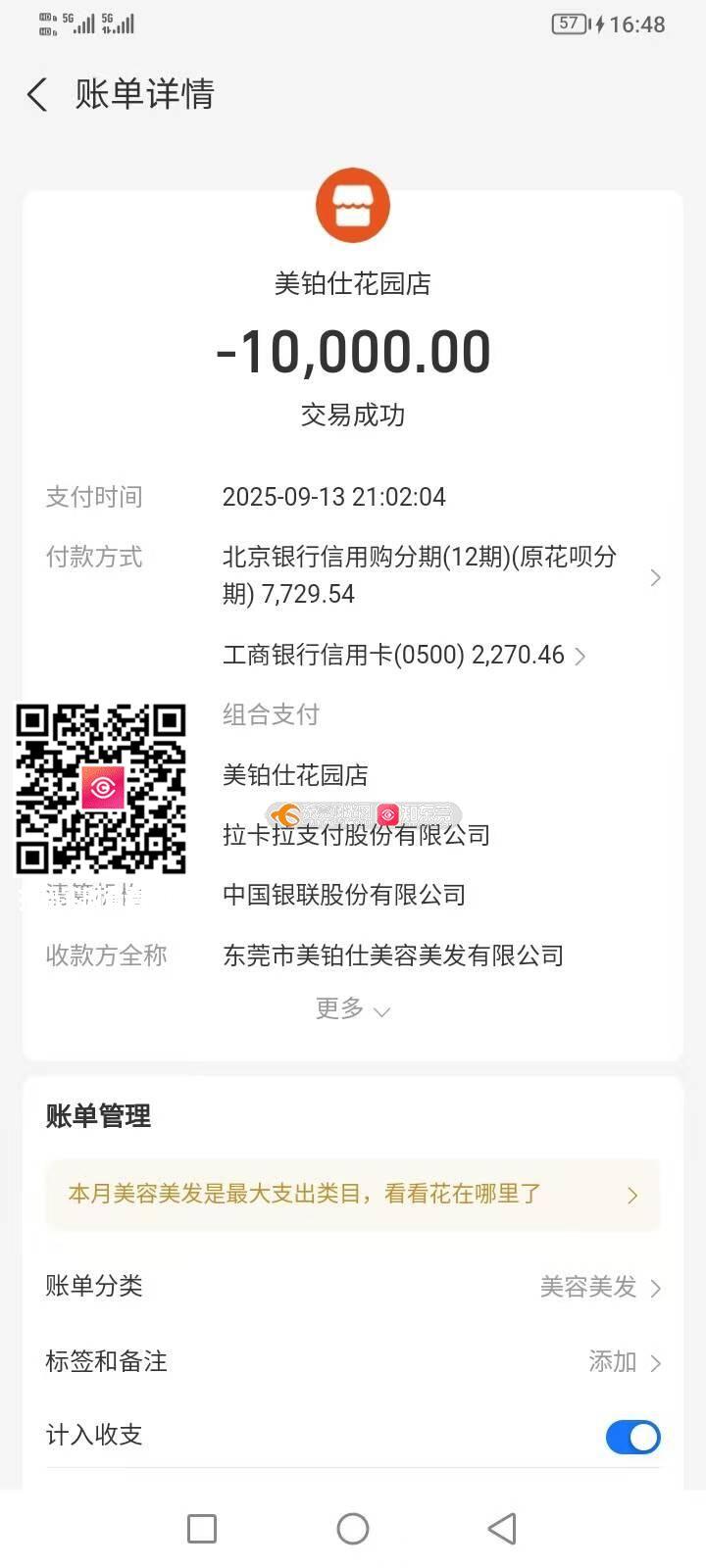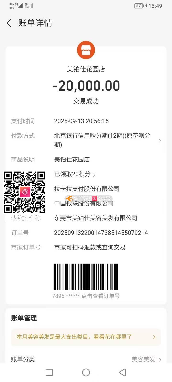 我和我老公7月份在此店大朗美铂仕花园店 消费被推销员诱惑推销美容身体推拿14经络项目,本来不想使用一直在推销,没那么钱支付,又诱惑使用花呗信用卡支付又不给单据和发票,只签了价格单,费用分别在7月和9🈷️ 支付,这项目只做2次,每个部位有10次,后来10🈷️ 26日在去此店消费发现关闭了没做门口写了招租,门口贴了提示说可以去大朗富康路美铂仕店消费,后来我10月27日晚上我去大朗富康路美铂仕店咨询,查不到客户有关美容等项目档案资料,还有那个店员说美铂仕只是个品牌,每个店老板不一样,我怀疑这种都是美容美发店的套路,受害者不只我一个还有其他人,我希望相关部门去彻查,还我们消费者公道,我要拿回我的钱