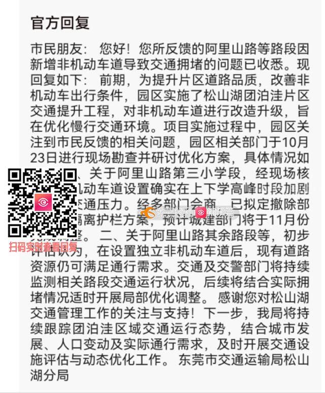 尊敬的市民,您好!您反映的问题已收悉。现回复如下:目前阿里山路正在实施非机动车道改造项目,以满足大量非机动车的通行需求,并保证通行安全。目前在施工阶段,可能会因施工围挡造成交通拥堵,待项目实施后,此状况将缓解。后期,园区相关主管部门会对交通情况进行分析。感谢您对我们工作的理解与支持,祝您生活愉快。松山湖城市建设局。