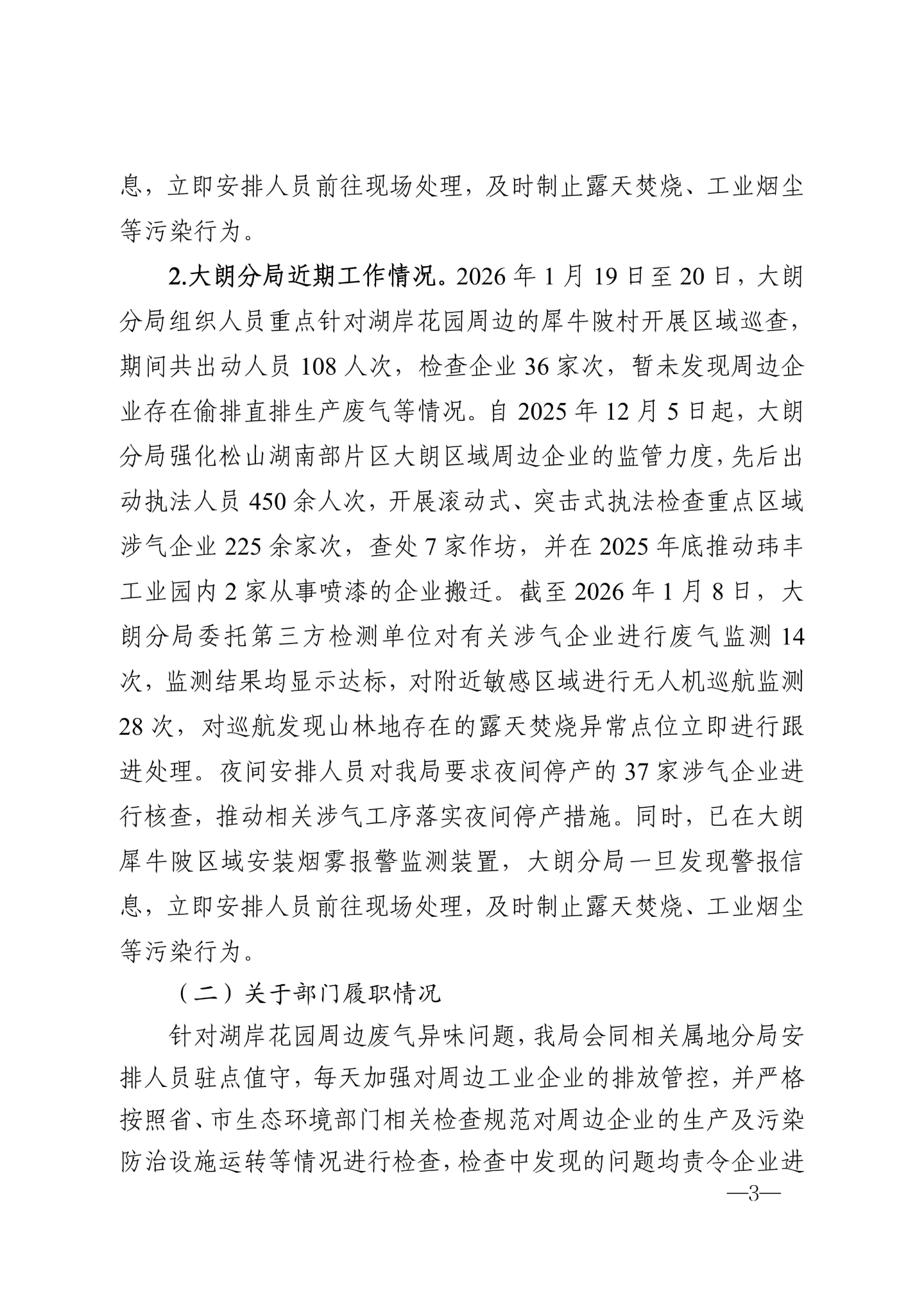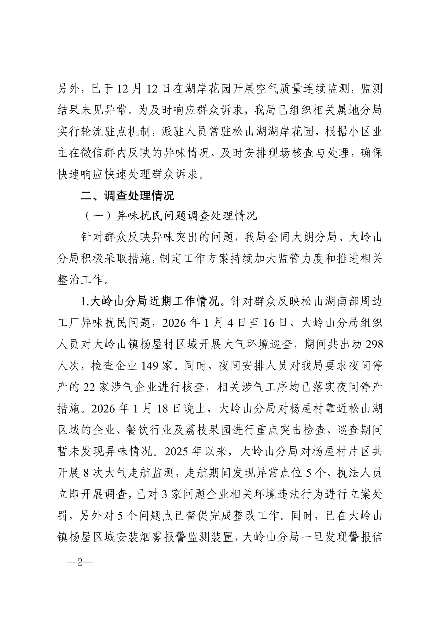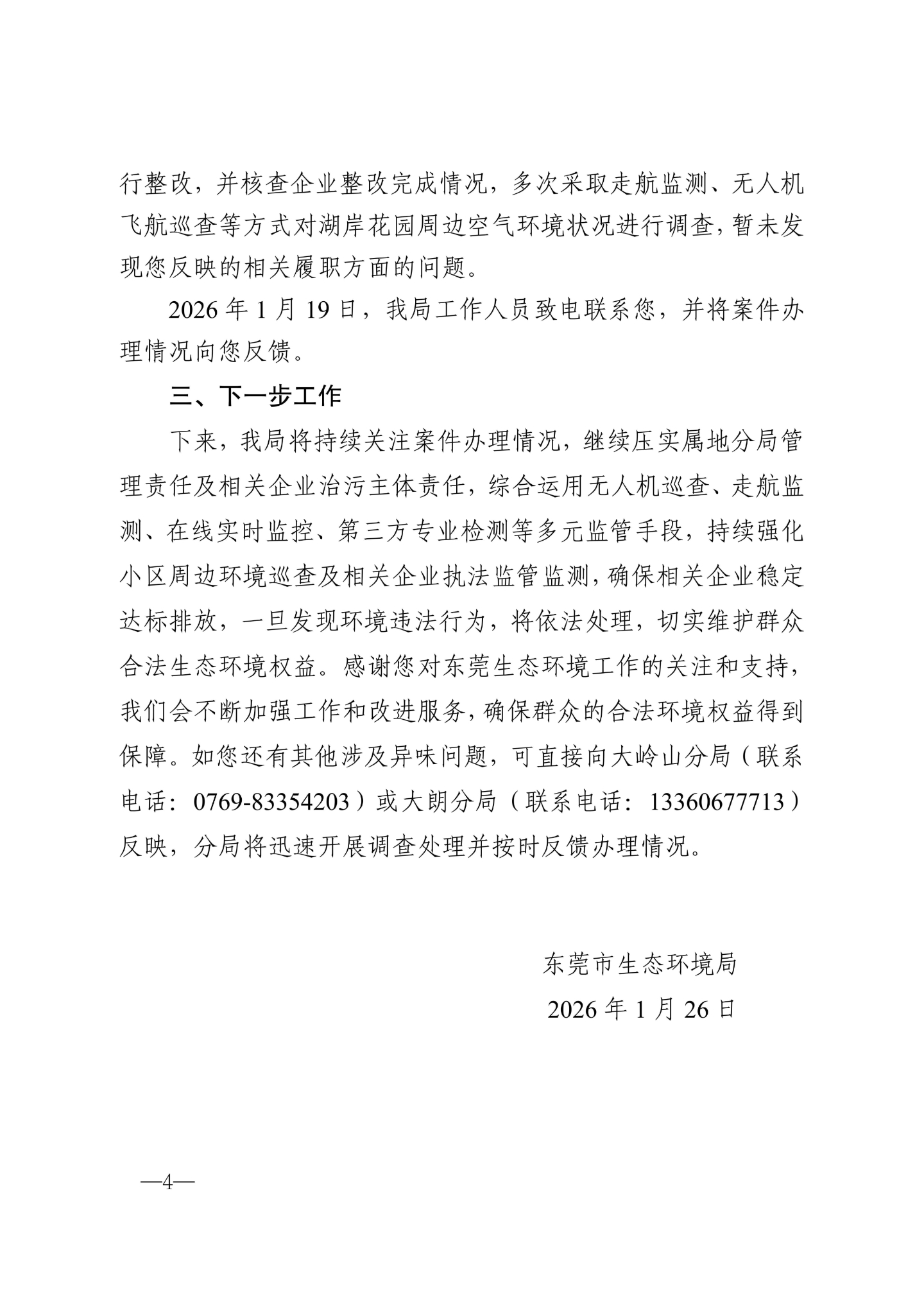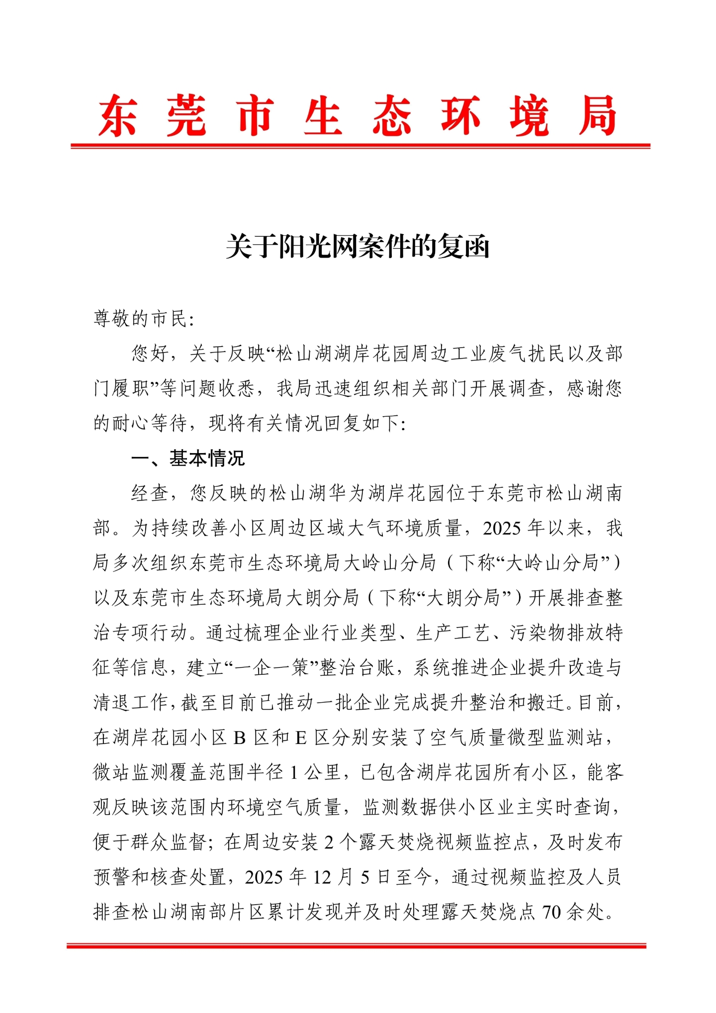 尊敬的市民: 您好,关于反映“松山湖湖岸花园周边工业废气扰民以及部门履职”等问题收悉,我局迅速组织相关部门开展调查,感谢您的耐心等待,现将有关情况回复如下: 一、基本情况 经查,您反映的松山湖华为湖岸花园位于东莞市松山湖南部。为持续改善小区周边区域大气环境质量,2025年以来,我局多次组织东莞市生态环境局大岭山分局(下称“大岭山分局”)以及东莞市生态环境局大朗分局(下称“大朗分局”)开展排查整治专项行动。通过梳理企业行业类型、生产工艺、污染物排放特征等信息,建立“一企一策”整治台账,系统推进企业提升改造与清退工作,截至目前已推动一批企业完成提升整治和搬迁。目前,在湖岸花园小区B区和E区分别安装了空气质量微型监测站,微站监测覆盖范围半径1公里,已包含湖岸花园所有小区,能客观反映该范围内环境空气质量,监测数据供小区业主实时查询,便于群众监督;在周边安装2个露天焚烧视频监控点,及时发布预警和核查处置,2025年12月5日至今,通过视频监控及人员排查松山湖南部片区累计发现并及时处理露天焚烧点70余处。另外,已于12月12日在湖岸花园开展空气质量连续监测,监测结果未见异常。为及时响应群众诉求,我局已组织相关属地分局实行轮流驻点机制,派驻人员常驻松山湖湖岸花园,根据小区业主在微信群内反映的异味情况,及时安排现场核查与处理,确保快速响应快速处理群众诉求。 二、调查处理情况 (一)异味扰民问题调查处理情况 针对群众反映异味突出的问题,我局会同大朗分局、大岭山分局积极采取措施,制定工作方案持续加大监管力度和推进相关整治工作。因回复内容有1000字限制,故完整答复请查看附件。承办单位:东莞市生态环境局