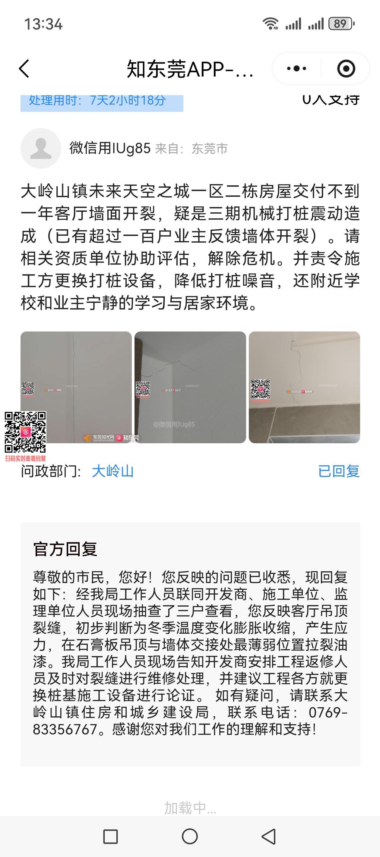 尊敬的市民,您好!您反映的问题已收悉,现回复如下:镇住建局联合松山湖住建局质量监督员及各方主体代表到现场进行入户抽查核查9-1402、9-2904、2-805),检查结论基本是装饰装修施工裂缝,不影响房屋主体结构使用安全,并督促开发商2月3日前妥善跟进您反映存在问题及时维修。如有疑问,请联系大岭山镇住房和城乡建设局,联系电话:0769-83356767。感谢您对我们工作的理解和支持!