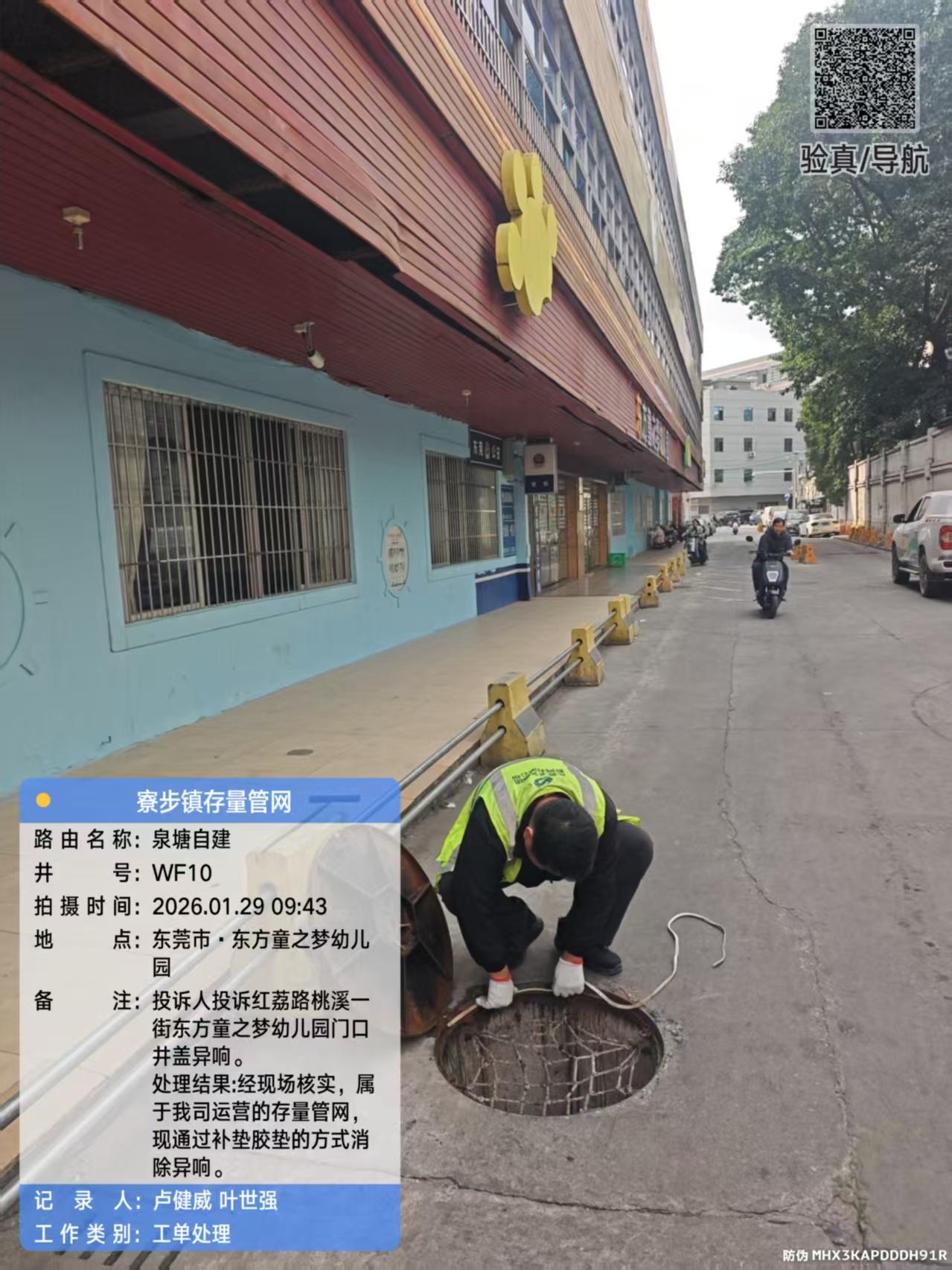 尊敬的市民,您好!您反映的问题已收悉,现回复如下:收到反映的情况后,我们于2026-01-29 09:57:05电话与您取得联系,并于2026-01-29 09:55:09对诉求进行办理。我中心安排工作人员到现场核查,并于井盖添加橡胶垫,目前已完成整治。如有疑问,请联系东莞市寮步镇水务工程运营中心,联系电话:076983321680。感谢您对我们工作的理解和支持!