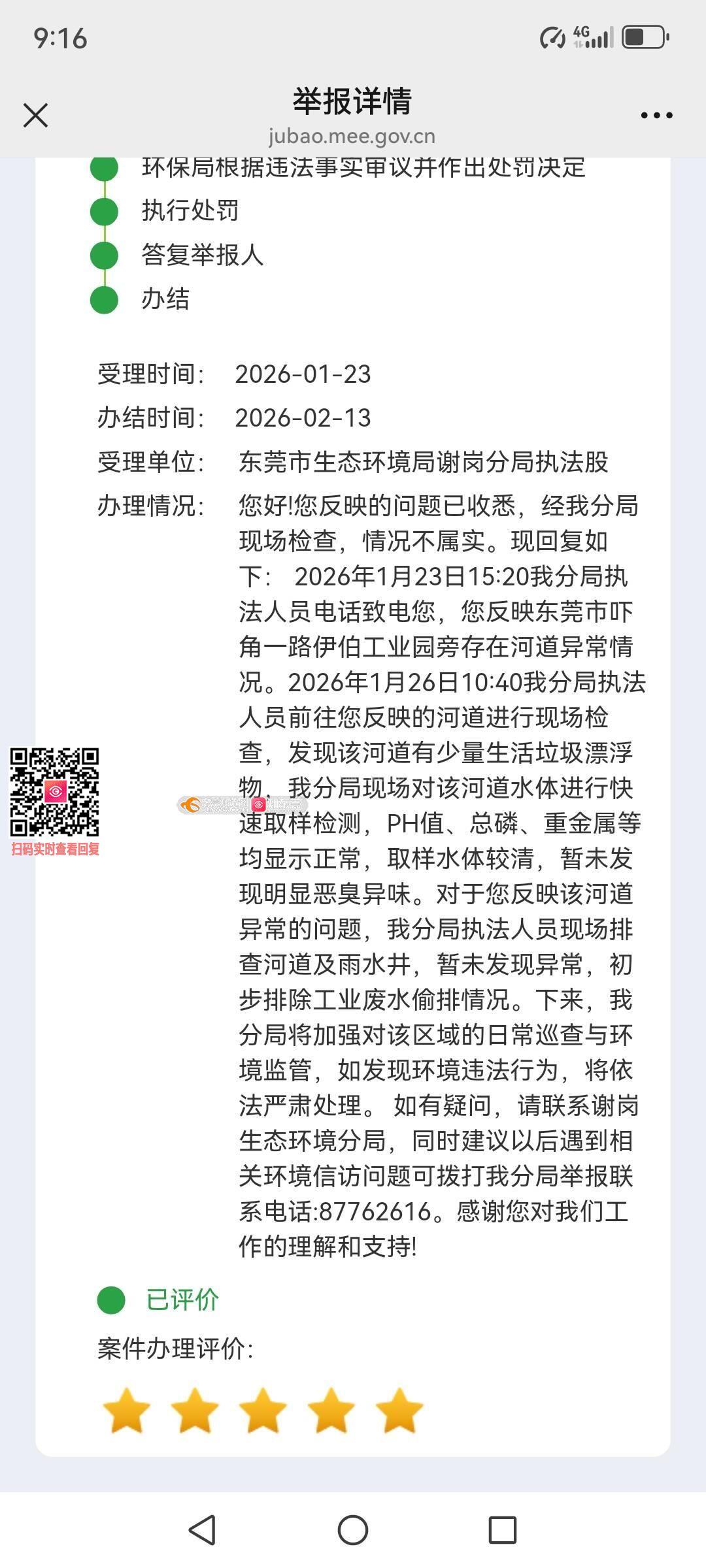 您好!您反映的问题已收悉,经我分局现场检查。现回复如下: 2026年3月2日10:05我分局执法人员电话致电您,您反映东莞市吓角一路伊伯工业园旁存在河道异常情况。2026年3月2日10:32我分局执法人员前往您反映的河道进行现场检查,发现该河道有少量生活垃圾漂浮物,我分局现场对该河道水体进行快速取样检测,PH值、总磷、重金属等均显示正常,我分局执法人员现场排查河道及雨水井,暂未发现异常,初步排除工业废水偷排情况。对于您反映该河道异常的问题,我分局将加强对该区域的日常巡查与环境监管,如发现环境违法行为,将依法严肃处理。 如有疑问,请联系谢岗生态环境分局,同时建议以后遇到相关环境信访问题可拨打我分局举报联系电话:87762616。感谢您对我们工作的理解和支持!