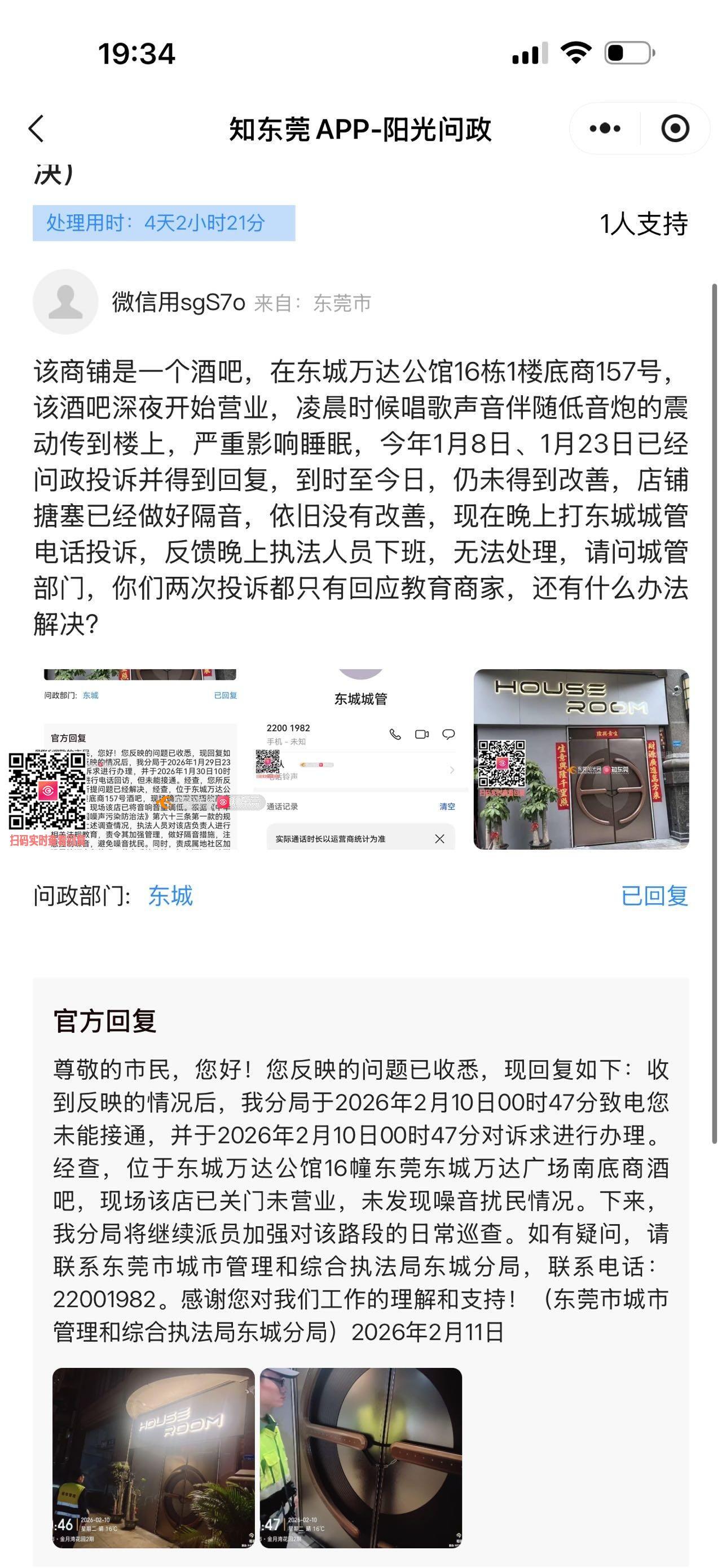尊敬的市民,您好!您反映的问题已收悉,现回复如下:收到反映的情况后,我分局于2026年3月9日23时05分电话与您取得联系,并于2026年3月9日23时10分对诉求进行办理。经查,位于东城万达公馆16栋1楼底商1**号酒吧,现场该店涉嫌播放高音音响产生噪音情况,现场该店已将音响音量调低。现场致电您,您表示出差在外不方便到您家里进行调查。该酒吧负责人表示已请专业人员到店勘查噪音情况提出整改方案。根据《中华人民共和国噪声污染防治法》第六十三条第一款的规定,综合上述调查情况,执法人员对该店负责人进行相关法规教育,责令其加强管理,尽快整改噪音扰民情况,做好隔音措施,注意控制噪音,避免噪音扰民。同时,责成属地社区加强属地巡查和管理,落实后续监管。如有疑问,请联系东莞市城市管理和综合执法局东城分局,联系电话:22001982。感谢您对我们工作的理解和支持!(东莞市城市管理和综合执法局东城分局)2026年3月12日
