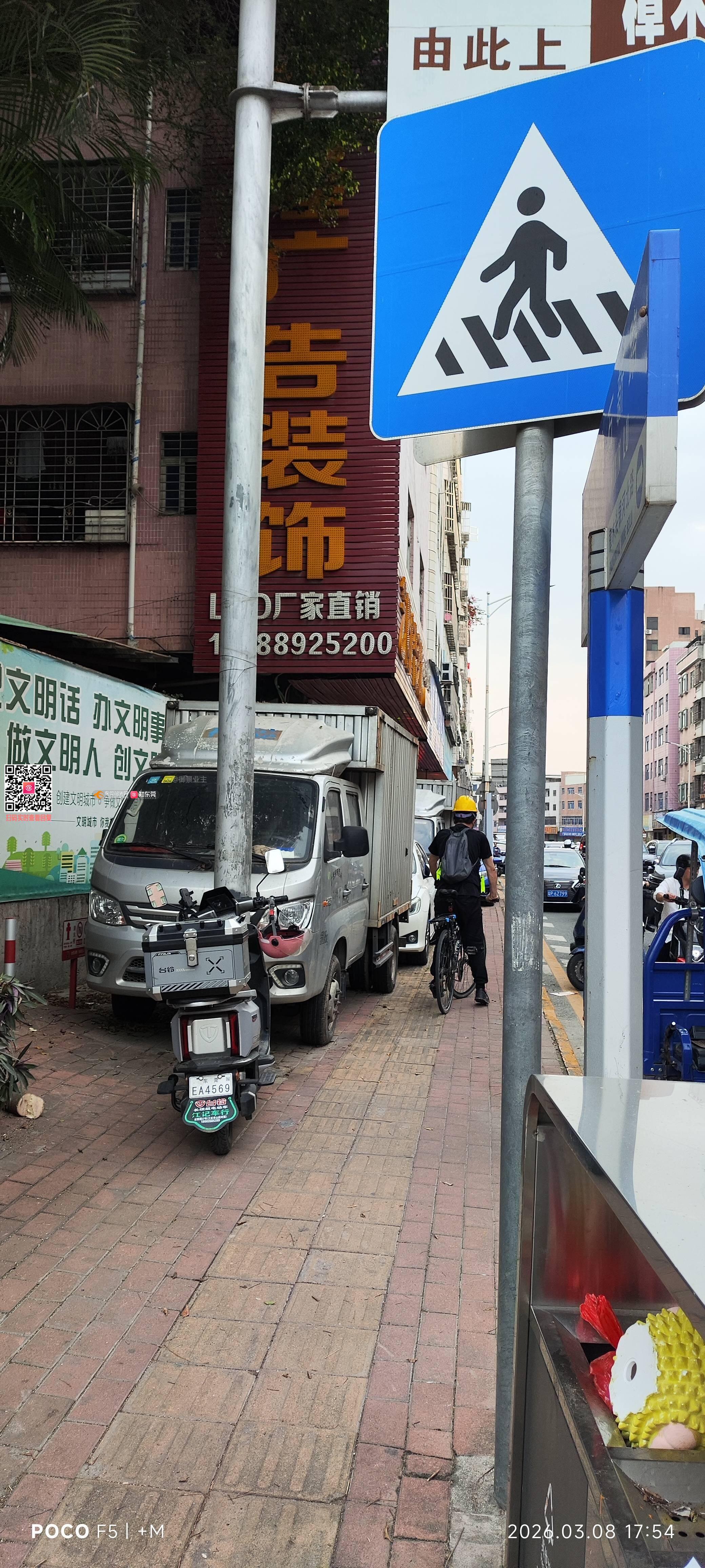 两边商铺门口本来是人行道,现在变成他们的私家停车位。导致电动车和行人没办法从马路通行,有些停车屁股还占一半马路,电动车行驶非常不安全,这条路两个初中学校的学生都要来来往往,希望引起重视