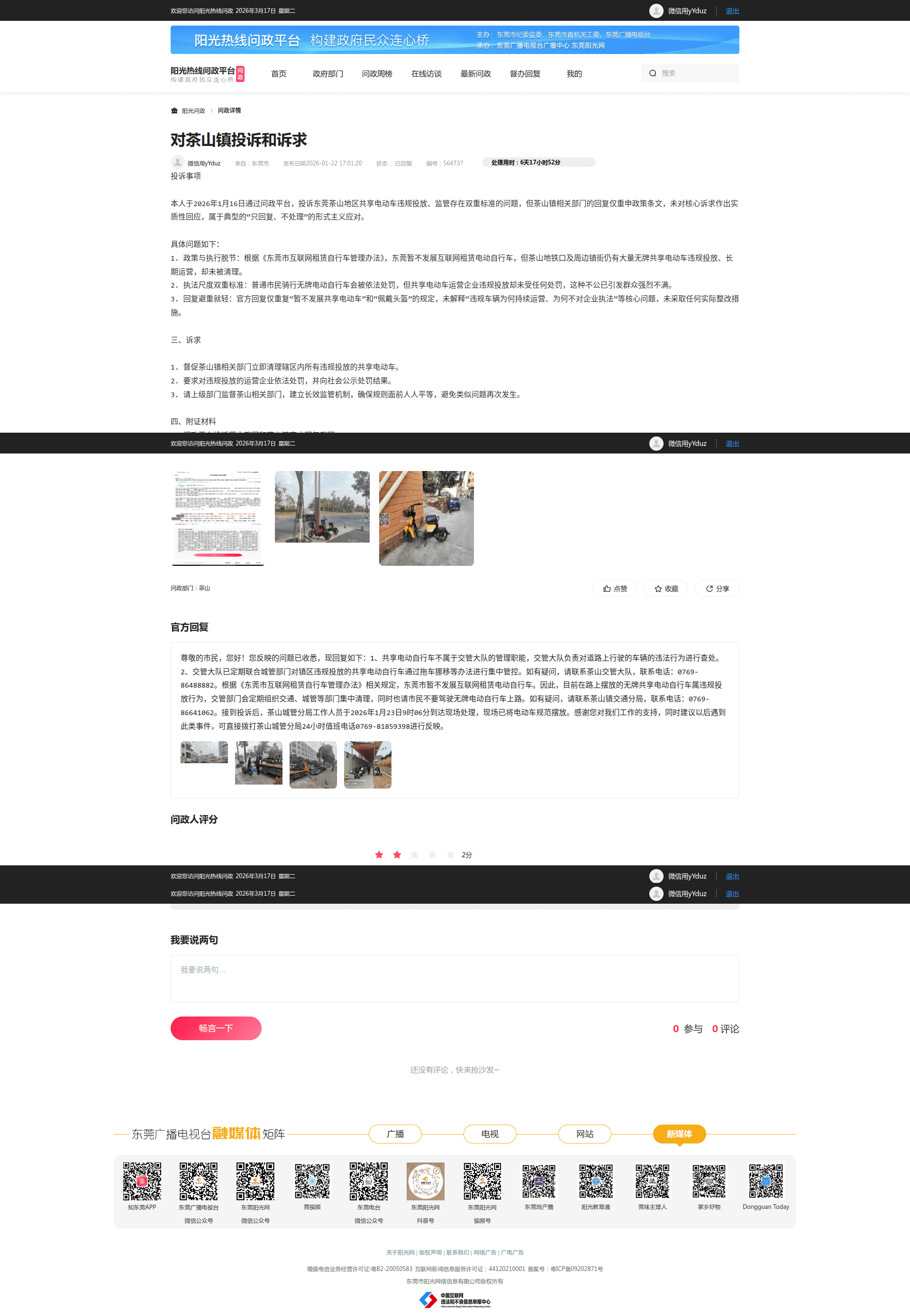 尊敬的茶山镇相关部门: 您好!本人此前投诉的共享电动自行车违规投放、占道经营问题,虽获部门回复(图8),但实际违规车辆仍未彻底清理,问题反复出现(图片是茶山地铁口及附近)。为避免形式主义、保障法规公平执行,现提出以下建议: 1、建立定时 “回头看” 机制:建议城管、交警、交通等部门联合,每周至少 1 次对辖区内违规投放、无牌上路、占道停放的共享电动自行车进行集中清理,防止问题反弹。 2、强化企业惩戒与公开:对多次违规的运营企业依法处罚、约谈,并向社会公示结果,倒逼企业落实主体责任。 3、形成闭环管理:建立问题台账,记录清理点位、数量及涉事企业,对反复违规区域重点盯防,确保整改可追溯、可核查。 4、畅通监督渠道:公开举报方式,鼓励市民监督违规行为,同时定期向社会公示整治进展,保障群众知情权与监督权。 恳请部门重视落实,切实维护《东莞市互联网租赁自行车管理办法》,保障市民出行安全与法治公平。