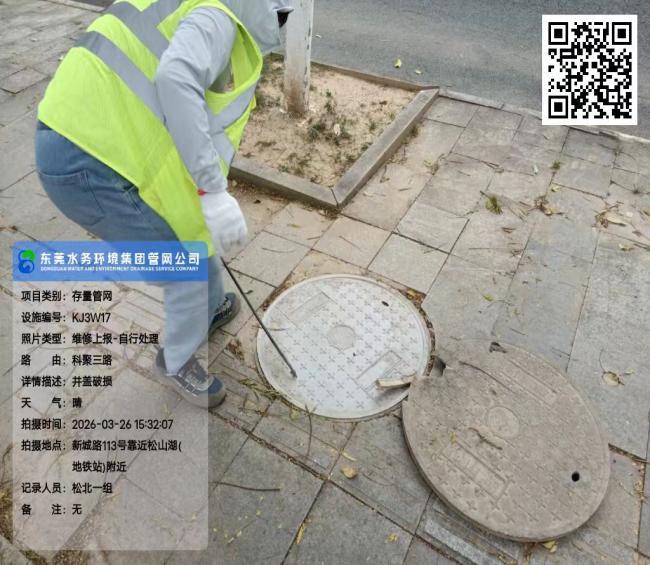 尊敬的市民,您好!您反映的问题已收悉,现回复如下: 收到反映的情况后,我们于2026年3月26日15:34对诉求进行办理,由于您的电话无人接听,我们未能与您取得联系。 经核实,您反映的井盖属于东莞市水务环境投资控股集团管网有限公司的运维范围。2026年3月26日,工作人员已完成井盖更换工作,目前该安全隐患已消除。 如有疑问,欢迎致电水务环境集团24小时客服热线96968,感谢您对我们工作的理解和支持!