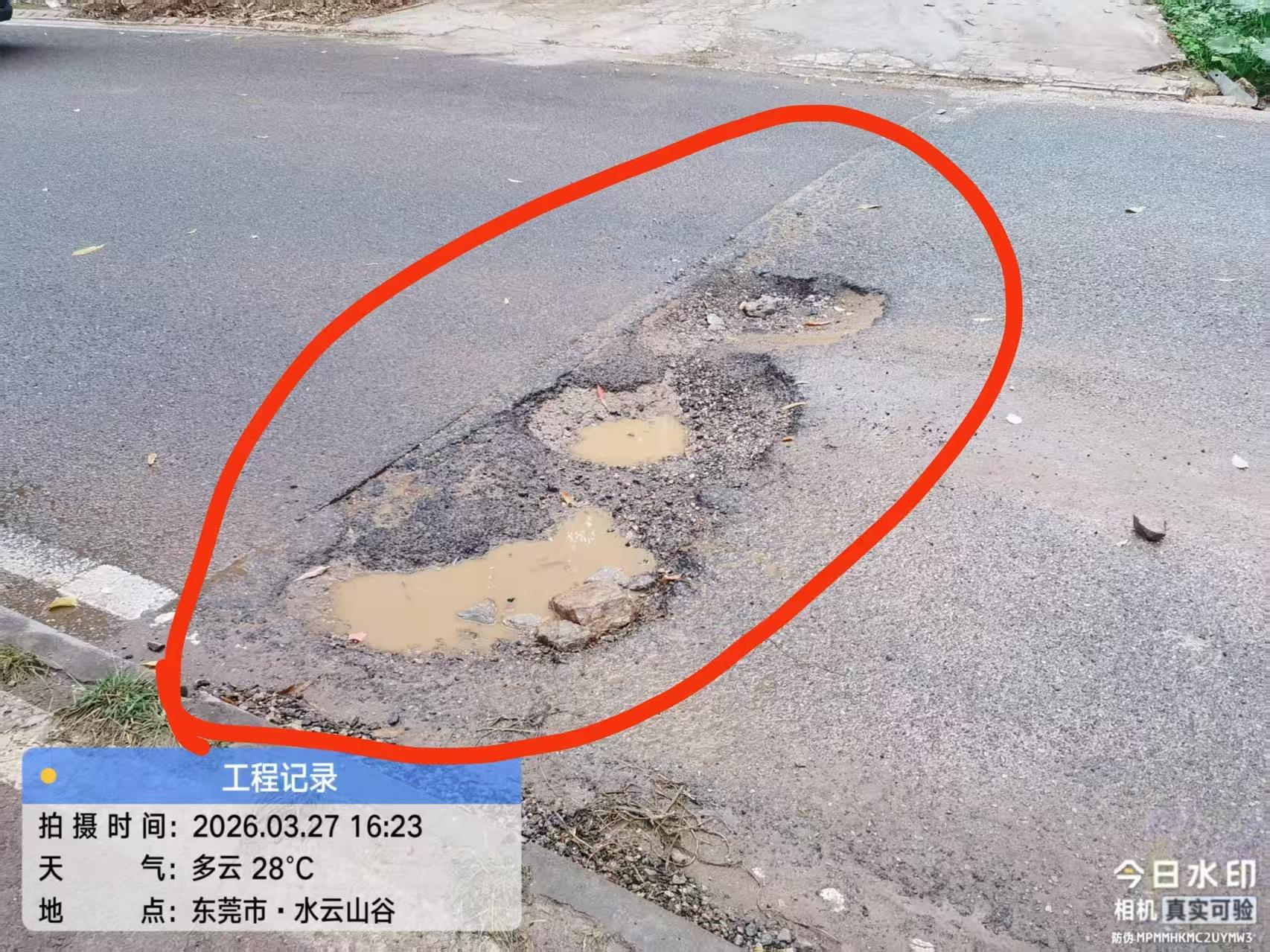 兴园路水云山谷门口道路破损,长期无人修复,存在安全隐患
