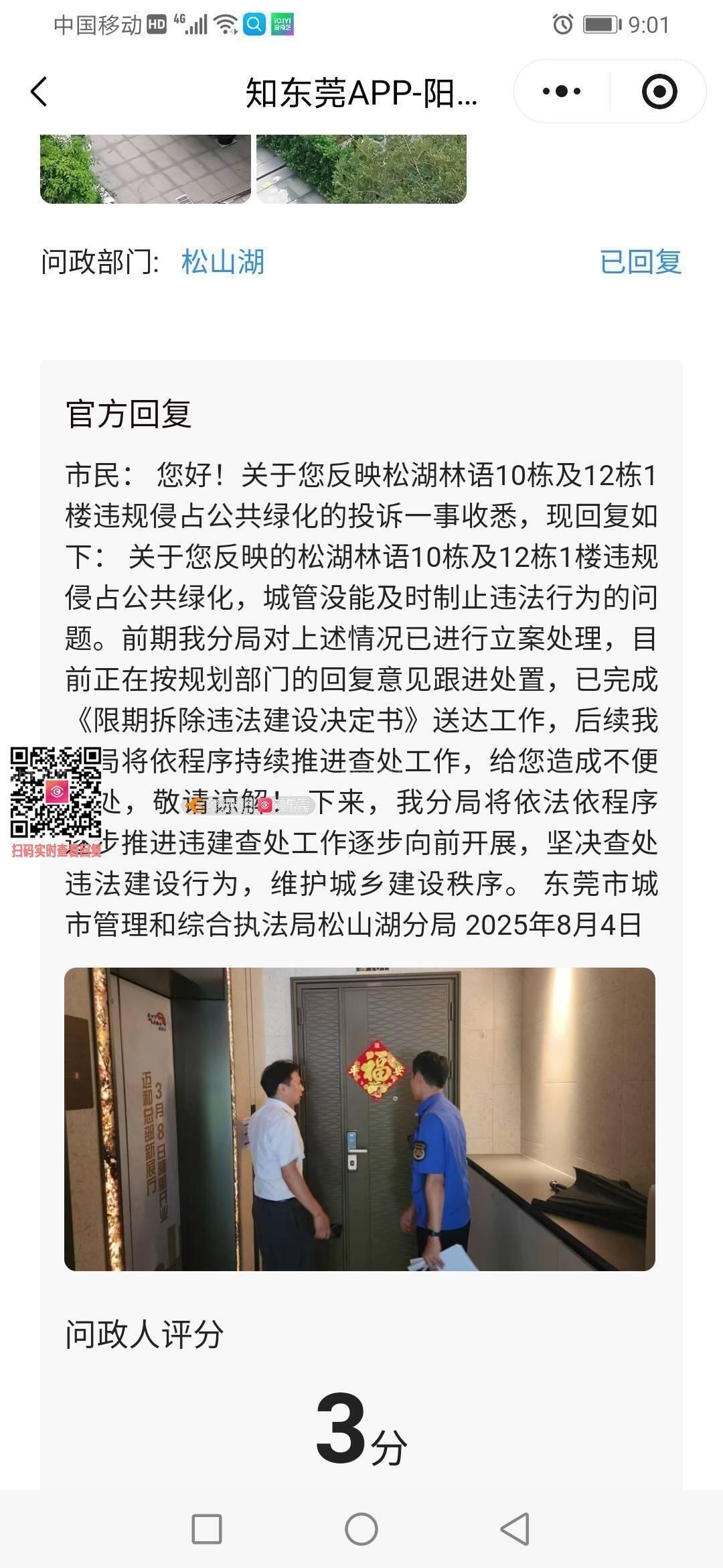 市民: 您好!关于您反映《松湖林语10栋及12栋1楼违规侵占公共绿化》的投诉一事收悉,现回复如下: 关于您反映的松湖林语10栋及12栋1楼违规侵占公共绿化,城管没能及时制止违法行为的问题。目前10栋1楼和12栋1楼占用公共绿化的两宗案件正在依据规划部门的认定意见跟进处理中,因当事人在法定期限内未申请行政复议或提起行政诉讼,亦未自行拆除违法建设,下一步我分局将依法启动催告程序,向当事人送达《限期拆除违法建设催告书》。由于12栋1楼存在新增搭建物情况,需再次向规划部门函询其规划报建情况,后续我分局将按程序跟进处理。我分局已于4月14日通过电话联系您,但因无人接听,无法将上述情况向您反馈,如有疑问,请致电22898081。 感谢您对松山湖城市管理工作的关注和支持。 东莞市城市管理和综合执法局松山湖分局