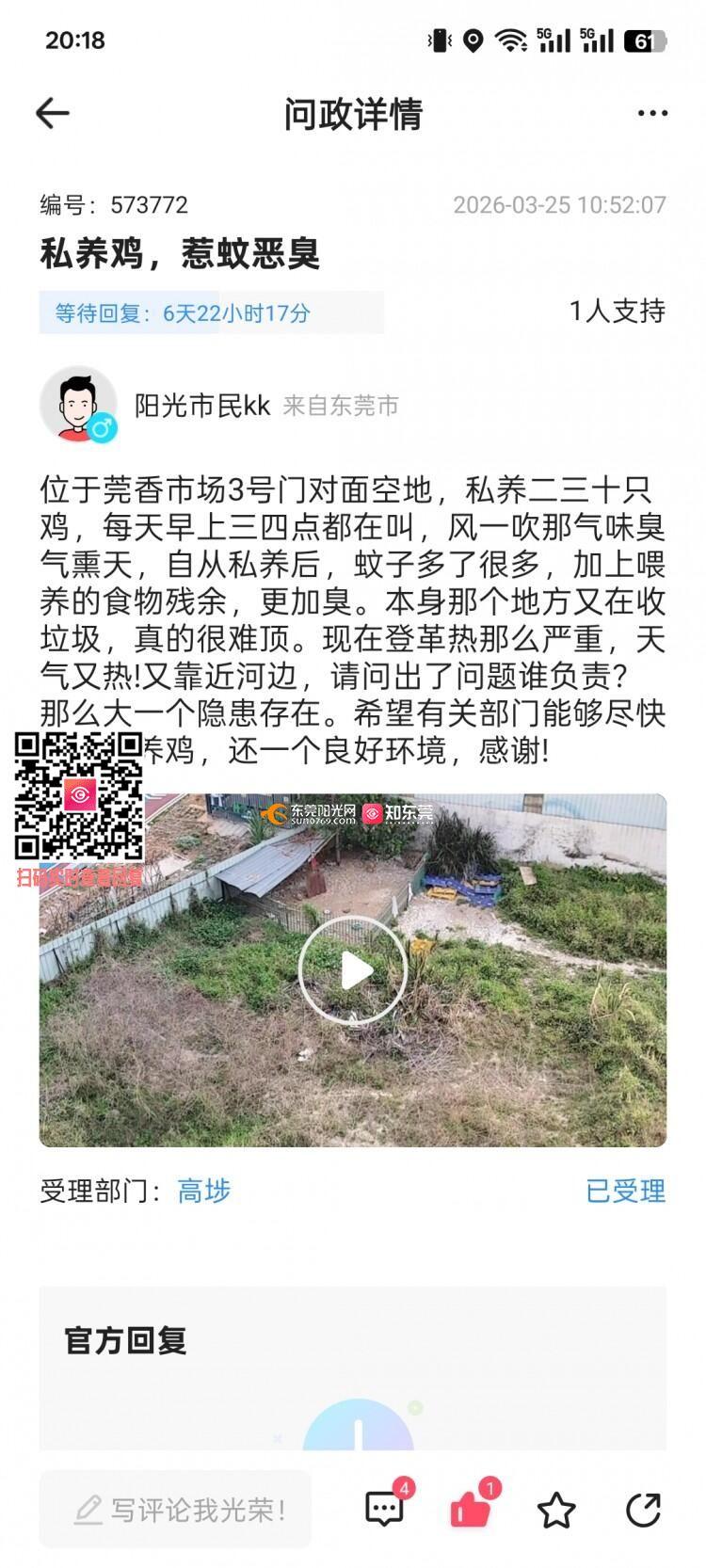 各位领导,于2026年3月25日投诉至高埗镇区请求处理私养家禽,但截止今天31号仍未处理,已经等待6天多了,又要等待6天,本身已经蚊子很多了,又喂养废弃食物,风一吹臭的很,本身夏天登革热那么严重,天天组织灭蚊,那么大一个隐患在,对方还经营回收废料废品,臭的很,请领导尽快协调处理,还一个良好环境!谢谢