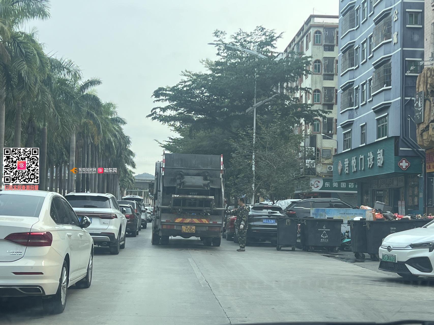 早上8点19分,垃圾车在作业,两车道剩一车道,车辆无法借道通过。