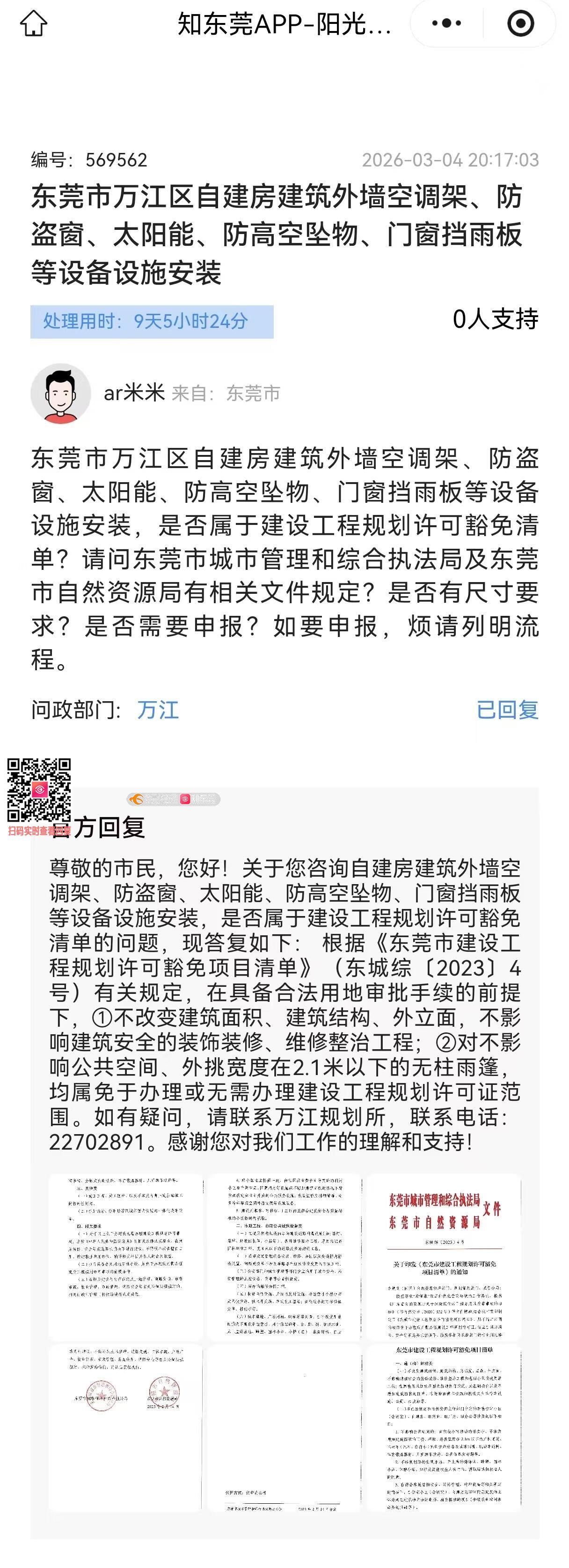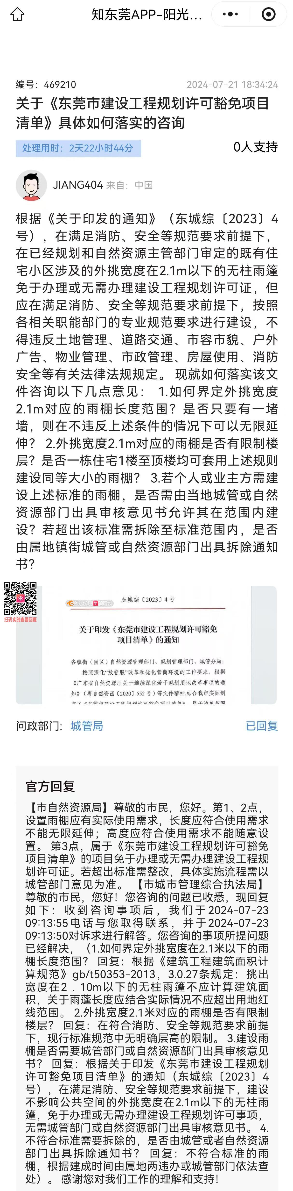 关于编号569562回复“①不改变建筑面积、建筑结构、外立面,不影响建筑安全的装饰装修、维修整治工程。”的认定。 官方阳光问政编号469210回复《建筑工程建筑面积计算规范》(GB/T50353-2013)第3.0.27条规定:挑出宽度在2.10m以下的无柱雨篷不计算建筑面积,雨蓬长度应结合实际情况不应超出用地红线范围。是否符合豁免清单中“不改变建筑面积”? 雨篷作为一种功能性附加设施,其本身就是突出于建筑外墙的构件。从设计逻辑上讲,任何类型的雨篷(无论是固定式还是伸缩式)必然会对建筑原有的外立面产生一定程度的改变,这是由其使用功能决定的。挑出宽度在2.10m以下的无柱雨篷是否属于豁免清单中“不改变外立面”的要求范围?若否,请说明功能性设施安装与“改变外立面”之间的认定边界。 空调外机架是否纳入"不改变外立面"豁免? 关于回复“②对不影响公共空间、外挑宽度在2.1米以下的无柱雨篷,均属免于办理或无需办理建设工程规划许可证范围。”的认定。 根据《东莞市建设工程规划许可豁免项目清单》,外挑宽度≤2.1米的无柱雨篷,是否满足:一、外挑宽度不超过2.1米;二、为无柱结构;三、长度不超出用地红线范围,不侵入公共空间。才属于"不影响公共空间、满足消防及安全规范"的豁免范围?