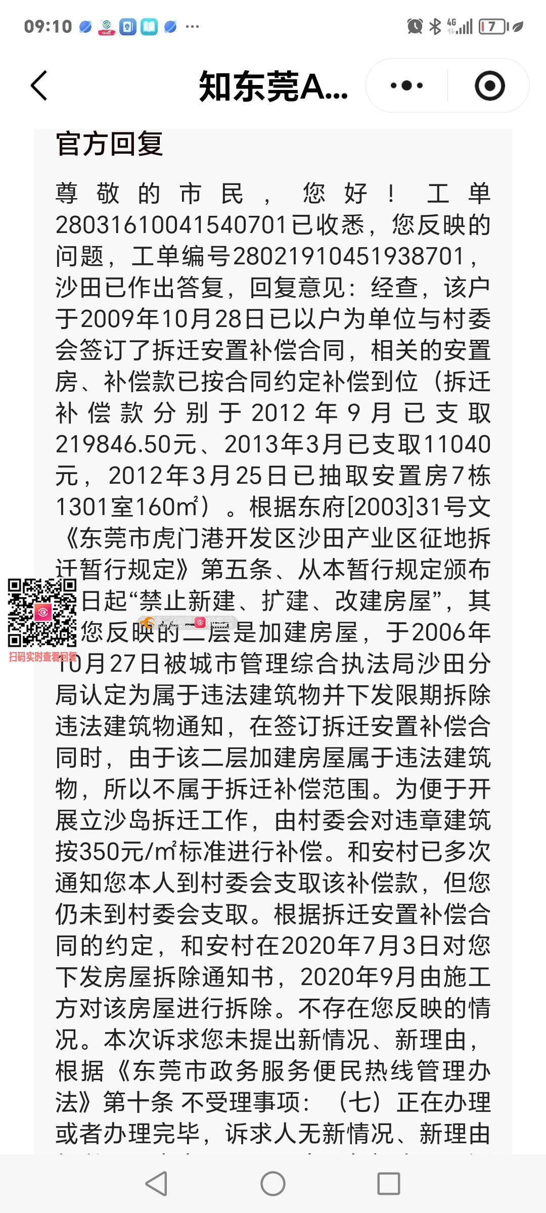 尊敬的市民,您好!工单28040710274727801已收悉,您反映的问题,工单编号28021910451938701,沙田已作出答复,回复意见:经查,该户于2009年10月28日已以户为单位与村委会签订了拆迁安置补偿合同,相关的安置房、补偿款已按合同约定补偿到位(拆迁补偿款分别于2012年9月已支取219846.50元、2013年3月已支取11040元,2012年3月25日已抽取安置房7栋1301室160㎡)。根据东府[2003]31号文《东莞市虎门港开发区沙田产业区征地拆迁暂行规定》第五条、从本暂行规定颁布之日起“禁止新建、扩建、改建房屋”,其中您反映的二层是加建房屋,于2006年10月27日被城市管理综合执法局沙田分局认定为属于违法建筑物并下发限期拆除违法建筑物通知,在签订拆迁安置补偿合同时,由于该二层加建房屋属于违法建筑物,所以不属于拆迁补偿范围。为便于开展立沙岛拆迁工作,由村委会对违章建筑按350元/㎡标准进行补偿。和安村已多次通知您本人到村委会支取该补偿款,但您仍未到村委会支取。根据拆迁安置补偿合同的约定,和安村在2020年7月3日对您下发房屋拆除通知书,2020年9月由施工方对该房屋进行拆除。不存在您反映的情况。本次诉求您未提出新情况、新理由,根据《东莞市政务服务便民热线管理办法》第十条 不受理事项:(七)正在办理或者办理完毕,诉求人无新情况、新理由仍以同一事实、同一理由重复提出同一诉求事项(含承办单位认定终结办理的事项),告知诉求人办理进展或者办理结果。