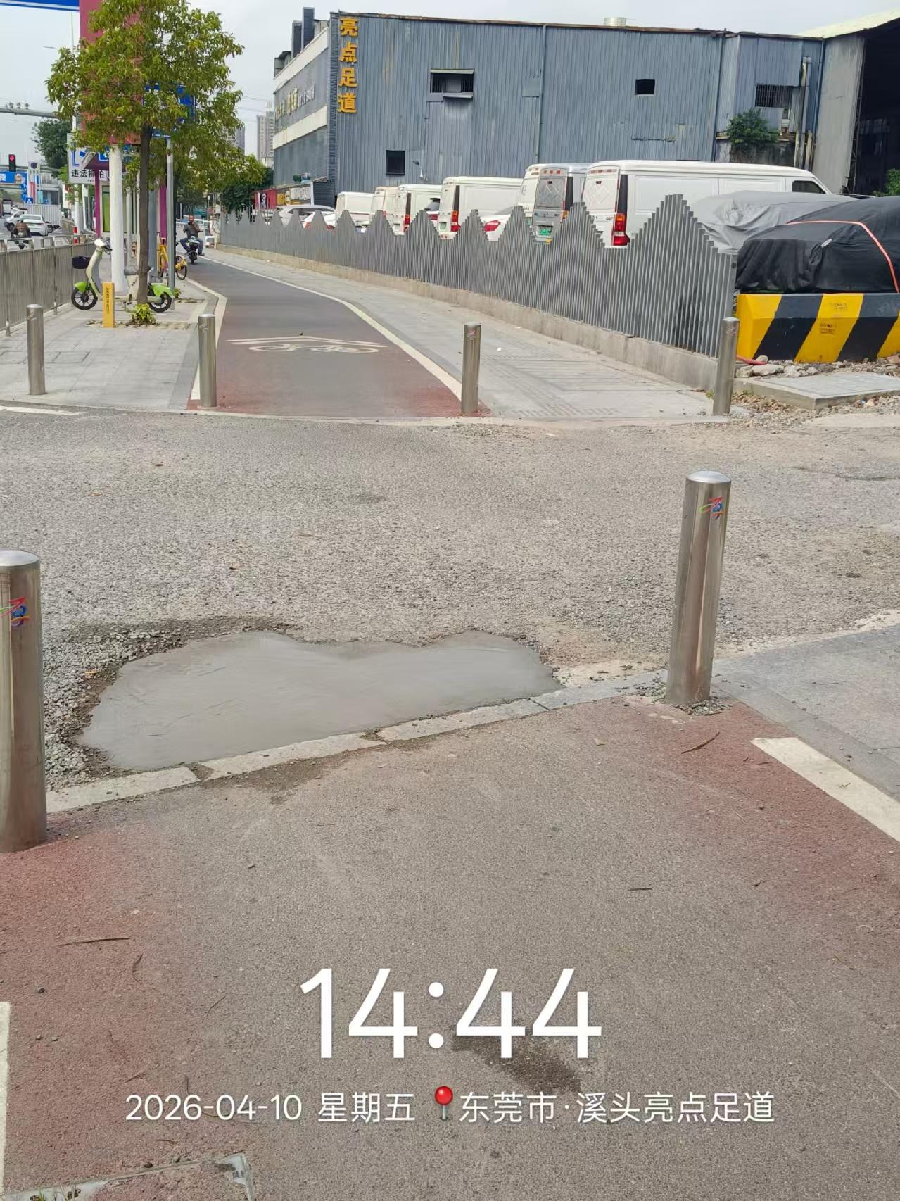 反馈图片3个问题,希望在合理范围内解决 地点都在厚街溪头市场对面亮点足道这边 图片1,地面破损,在非机动车道中间。图片2,这个非机动道位置因为中间有个建筑,只能两边通行,但是右边这个灯架实在是碍事,希望可以移动下,还有图三的两颗树,如果树不能动,能不能把树根处地面搞平整?
