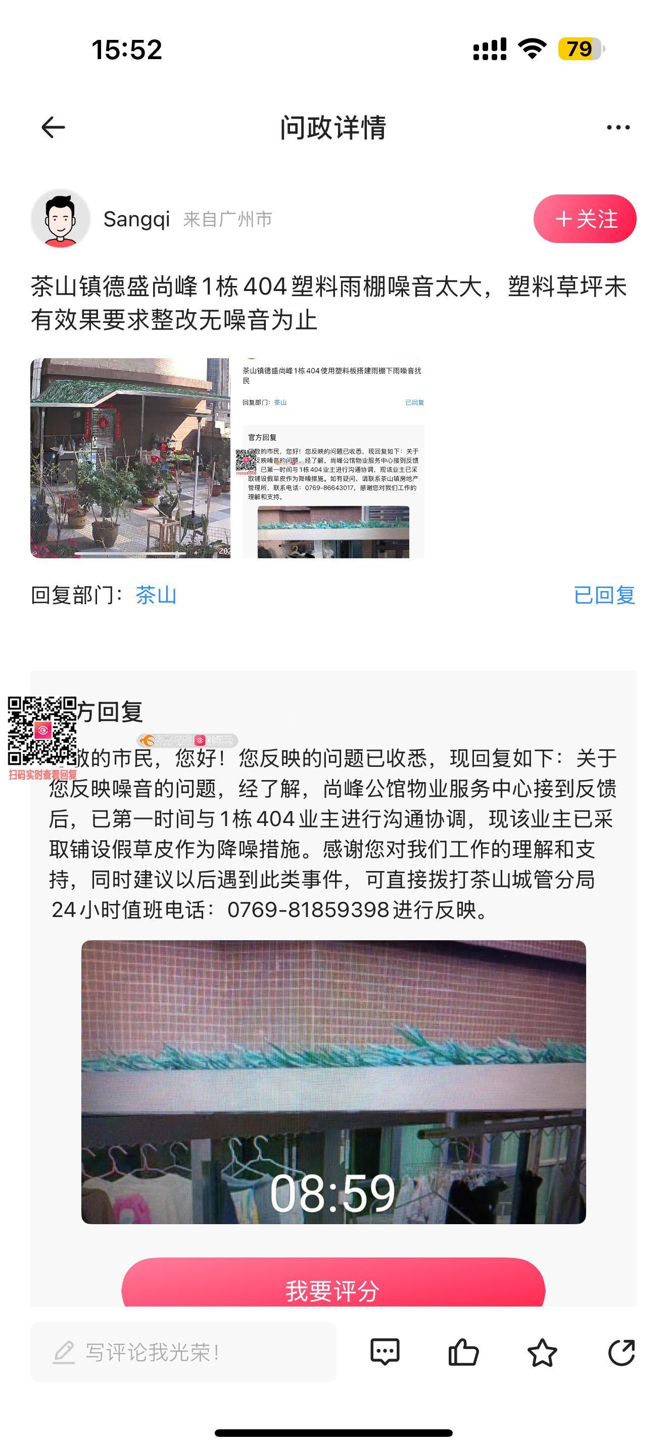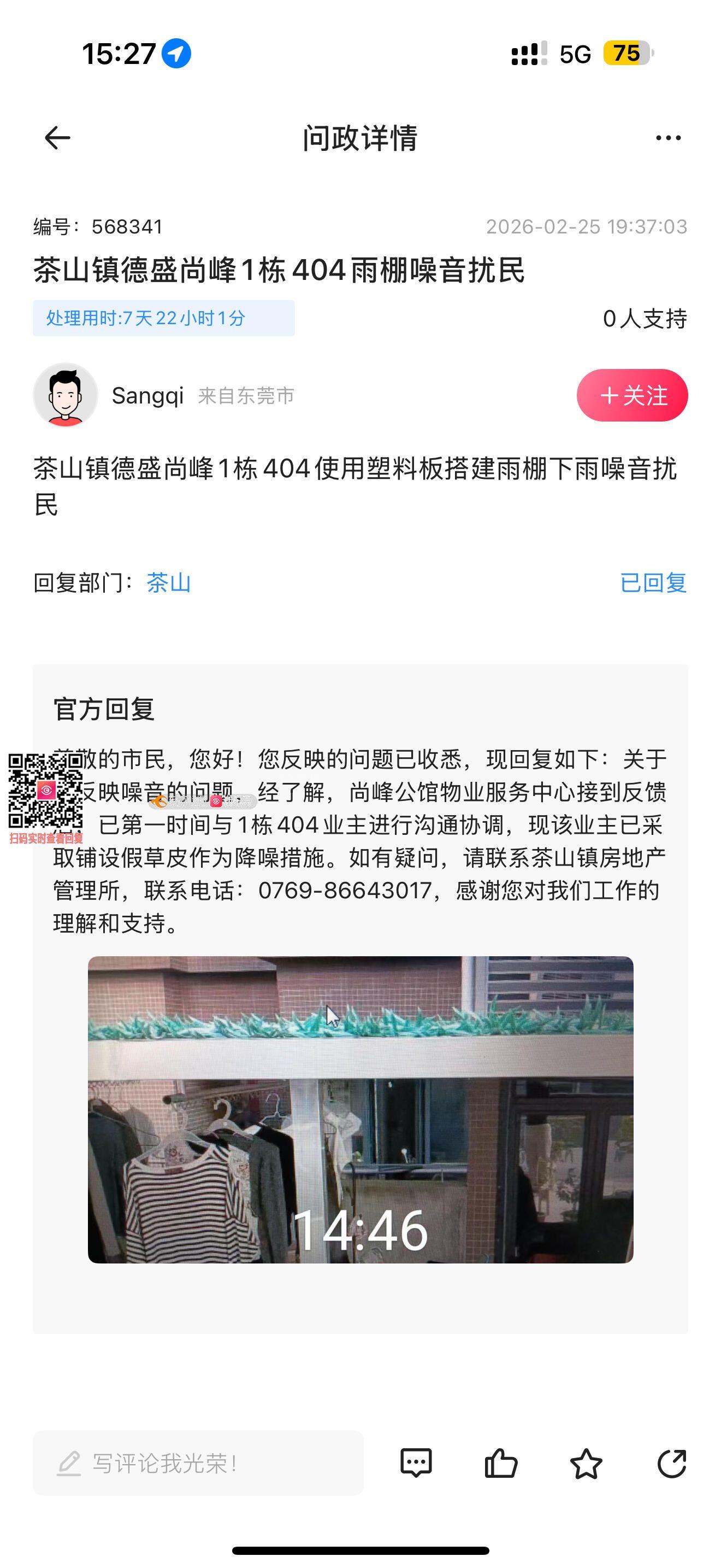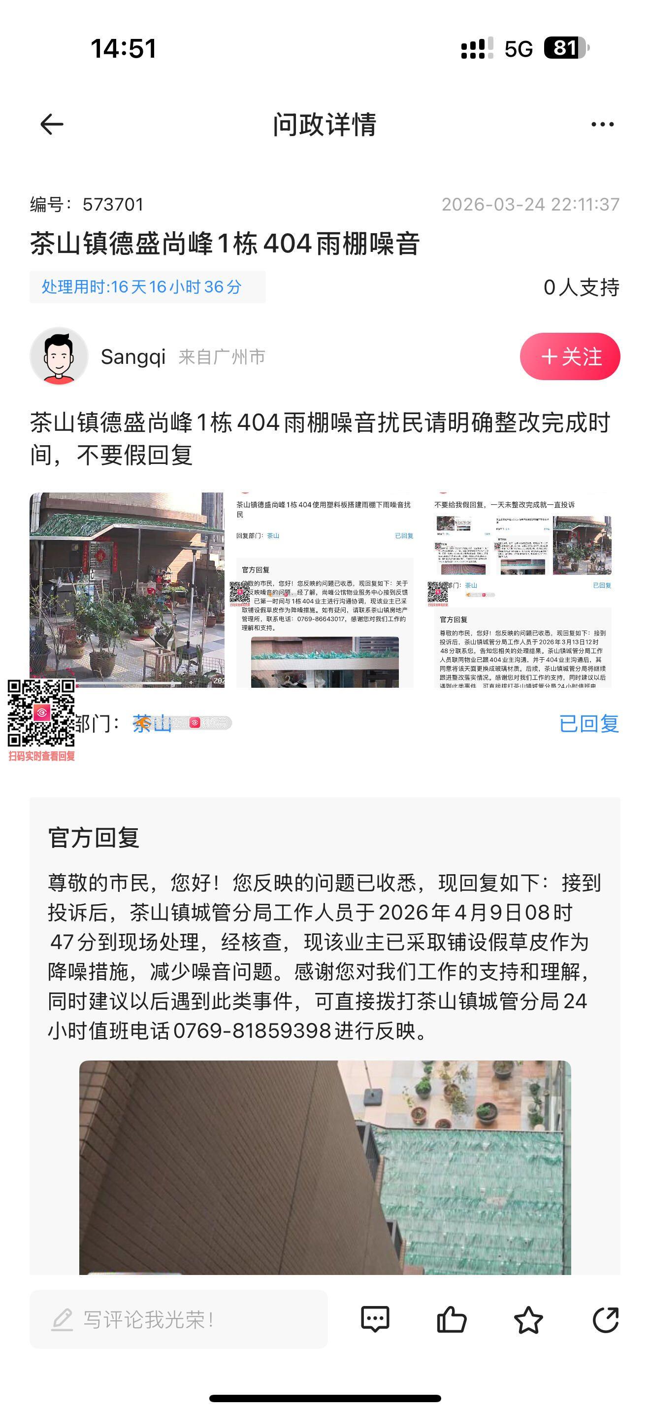 茶山镇德盛尚峰1栋404雨棚噪音扰民,请明确整改时间,如再次虚假回复将向市级反应