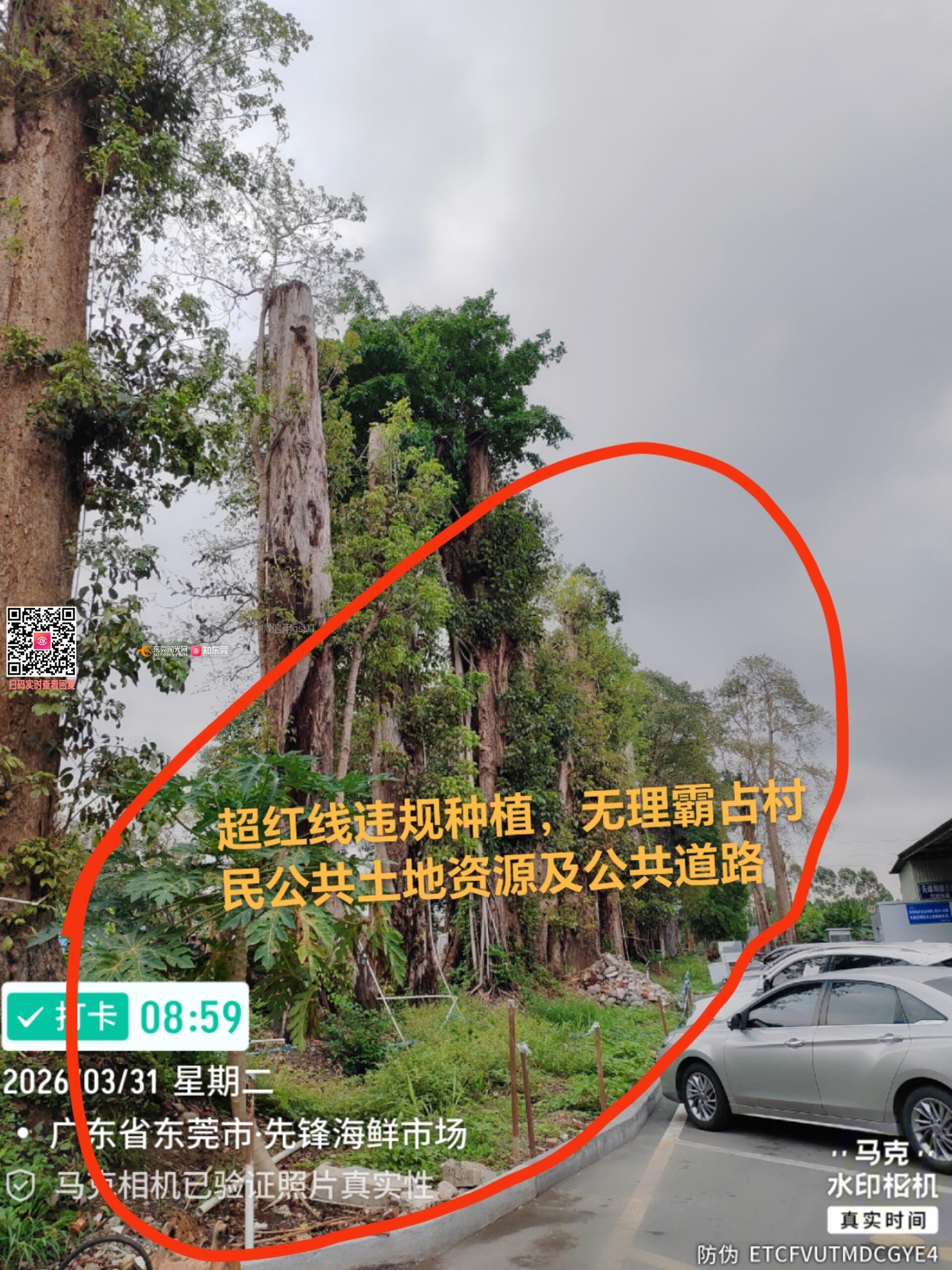 尊敬的市城管局领导: 现检举投诉权属人为:东莞市中驳港务有限公司、广东海建港务有限公司、东莞市中爱联砂石有限公司的花场参天大树20多年来一直超红线范围违规种植,无理霸占先锋村土地道路,严重侵害村民土地利益及当地发展规划。多年来,无视当地镇府执法机关部门,丝毫未损,长期在先锋村形成一股“土匪恶霸”黑势力,雄霸一方,愚弄全体村民土地利益,天理不容,我们全体村民万分厌恨,申诉无方!希当地政府及上级部门重视,重拳出击,挽回村民利益,伸张正义,还先锋村一片蓝天!谢