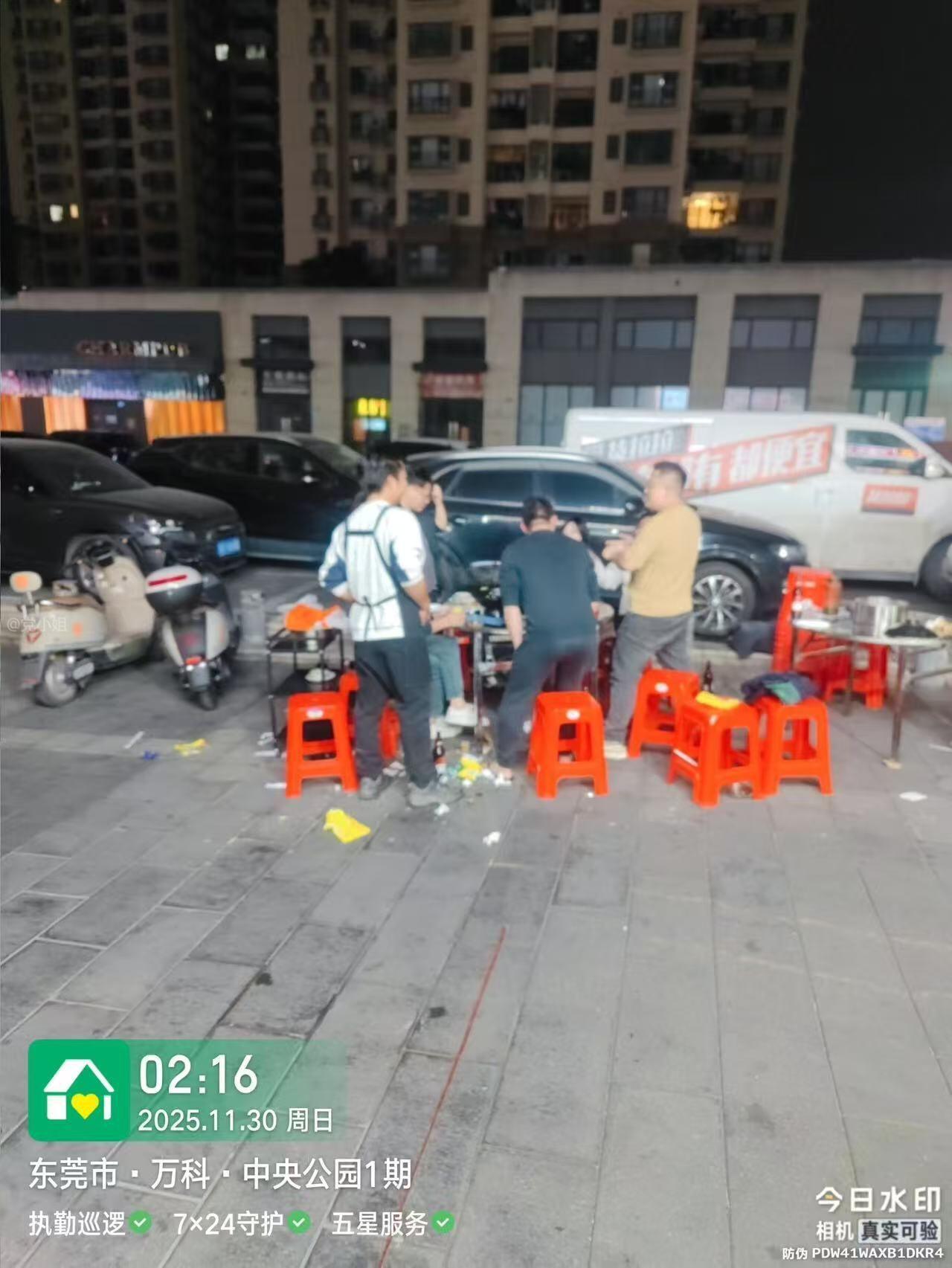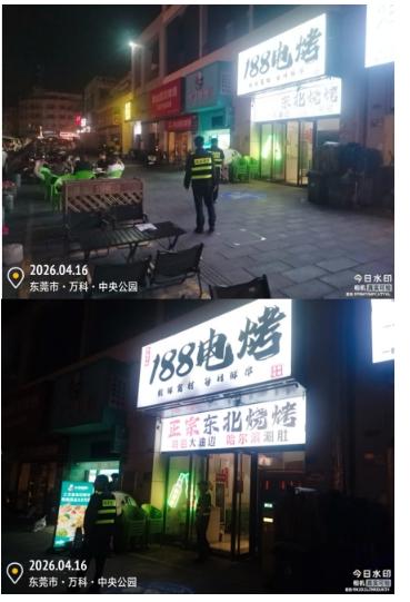 大朗万科中央公园楼下电烤188,整夜营业,并把桌椅放在外面。半夜这些消费人员喝醉酒楼下大声喧闹,大吼大叫。2026年4月13日这些人一直喝到早上7点多。夜间伴随大声吼叫。 请问居民楼下可以开这些整夜营业扰民的店面吗,并且桌椅摆在外面合法吗,并且噪声和垃圾污染附近环境,请执法部门加大执法力度,不要总是轻飘飘口头警告一下。