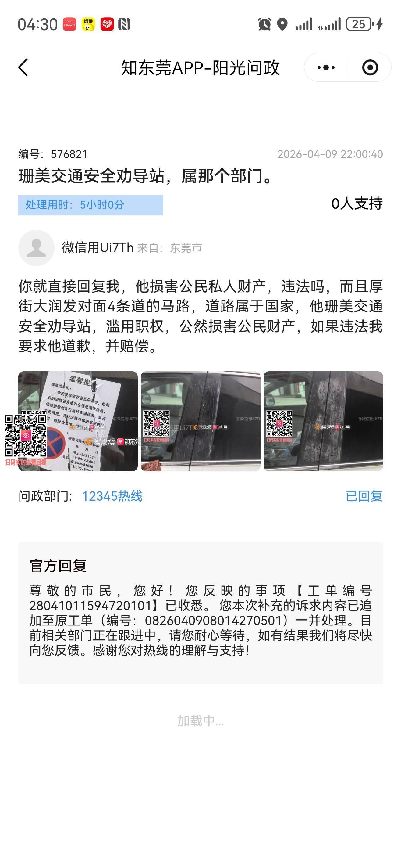 本人车辆于近期在东莞市厚街镇,南环路区域停放时,被相关工作人员在车身违规张贴强力不干胶贴纸,该贴纸粘性极强,强行撕下会严重损伤车漆及车膜,清理难度极大,已对车辆造成实际损害风险。 经了解,张贴单位并无合法执法权限,此类行为属于越权执法、故意损毁财物、侵犯公民财产权,严重不合理也不合法。 本人此前已在阳光问政平台提交投诉,至今已超过10天未收到任何部门回复及处理意见,已超出正常办理时限。现正式申请: 1. 尽快核实涉事张贴单位及责任人,责令立即停止此类违规贴车行为; 2. 安排专业人员对车辆残留胶痕进行免费清理,或承担相应清理及修复费用; 3. 对此次违规行为作出书面说明及道歉; 4. 请相关部门在规定时限内予以办结并正式回复。 恳请平台督促相关责任部门尽快处理,维护市民合法权益。