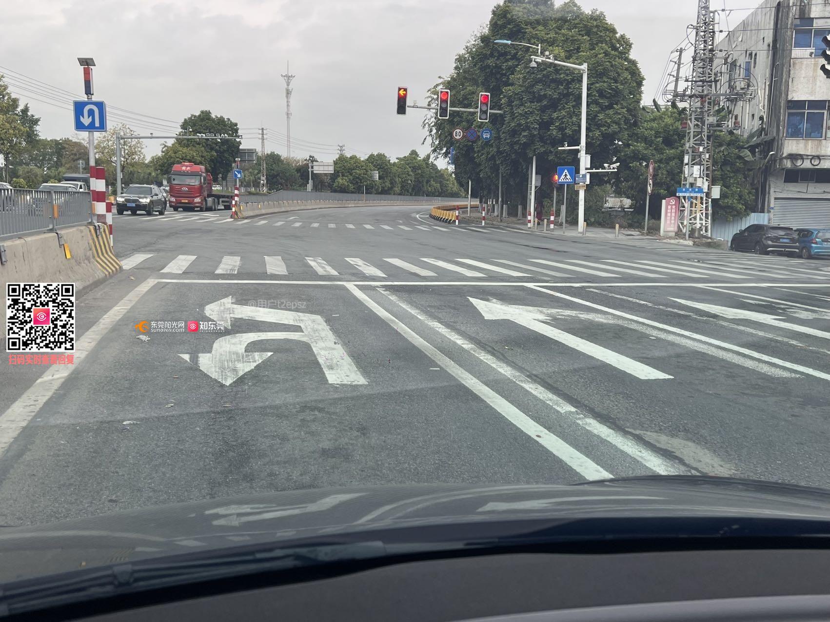 莞龙路鳌峙塘路段左转进入东江大道的路口两条左转道变成了一条,导致红灯等待时间变长,建议改回原来的两条车道,具体位置在图2