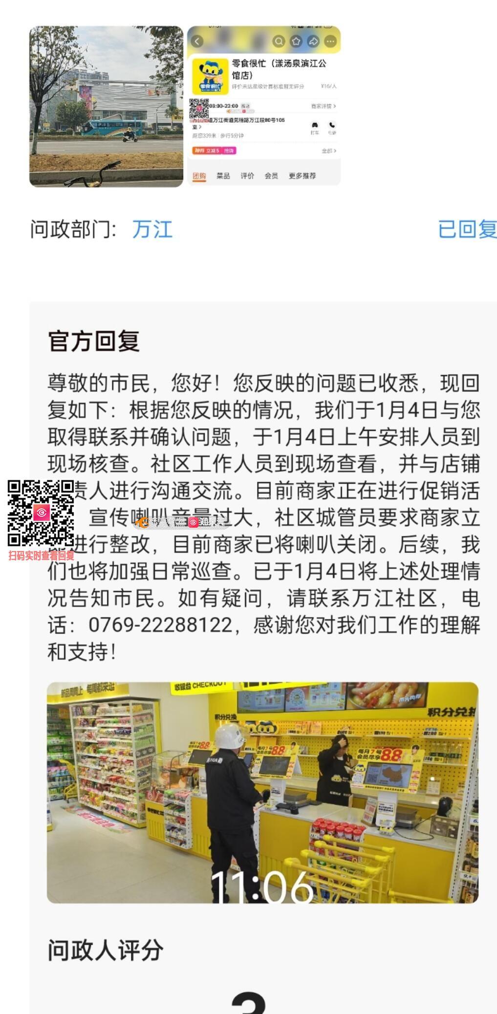 尊敬的市民,您好!您反映的问题已收悉,现回复如下:根据您反映的情况,我们于2月27日与您取得联系并确认问题,于2月27日下午安排人员到现场核查。经核查,社区工作人员到现场查看,并与店铺负责人进行沟通交流。目前商家正在进行促销活动,宣传喇叭音量过大,社区城管员要求商家立即进行整改,目前商家已将喇叭关闭,工作人员责令店铺负责人将喇叭使用范围限定在自家店铺内,拆除安装在路边的喇叭,避免对其他人员造成骚扰。店铺负责人承诺拆除喇叭并降低音量。后续,社区方面也将加强日常巡查。 已于3月2日将上述处理情况告知市民,市民表示这几天无噪音。如有疑问,请联系万江社区,电话:0769-22288122,感谢您对我们工作的理解和支持!