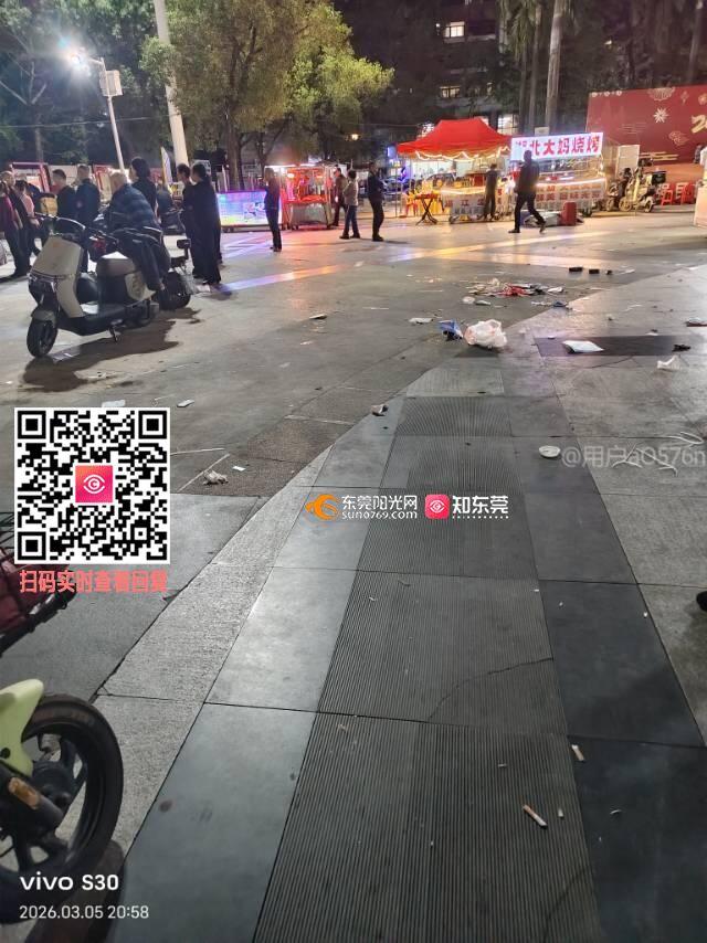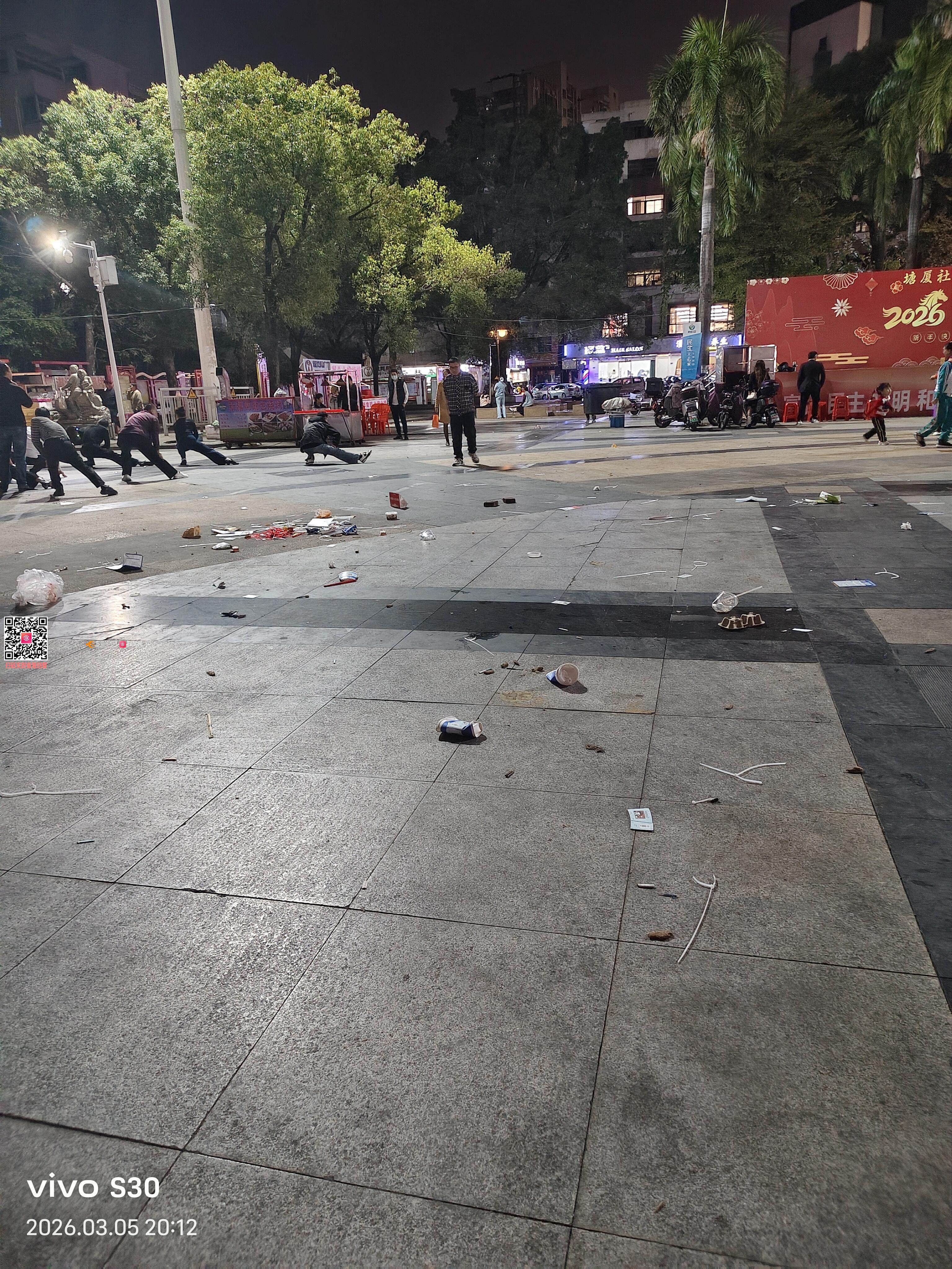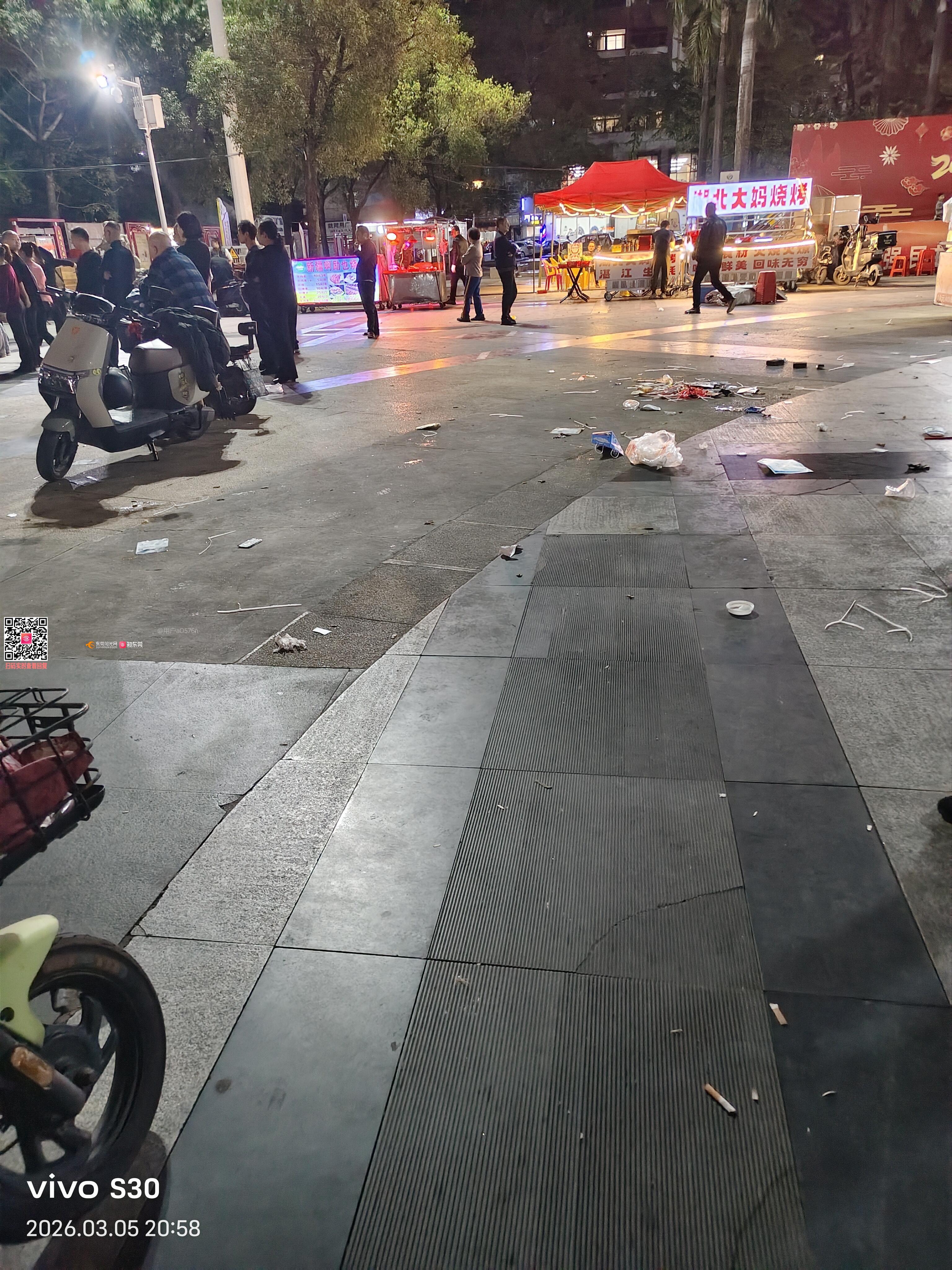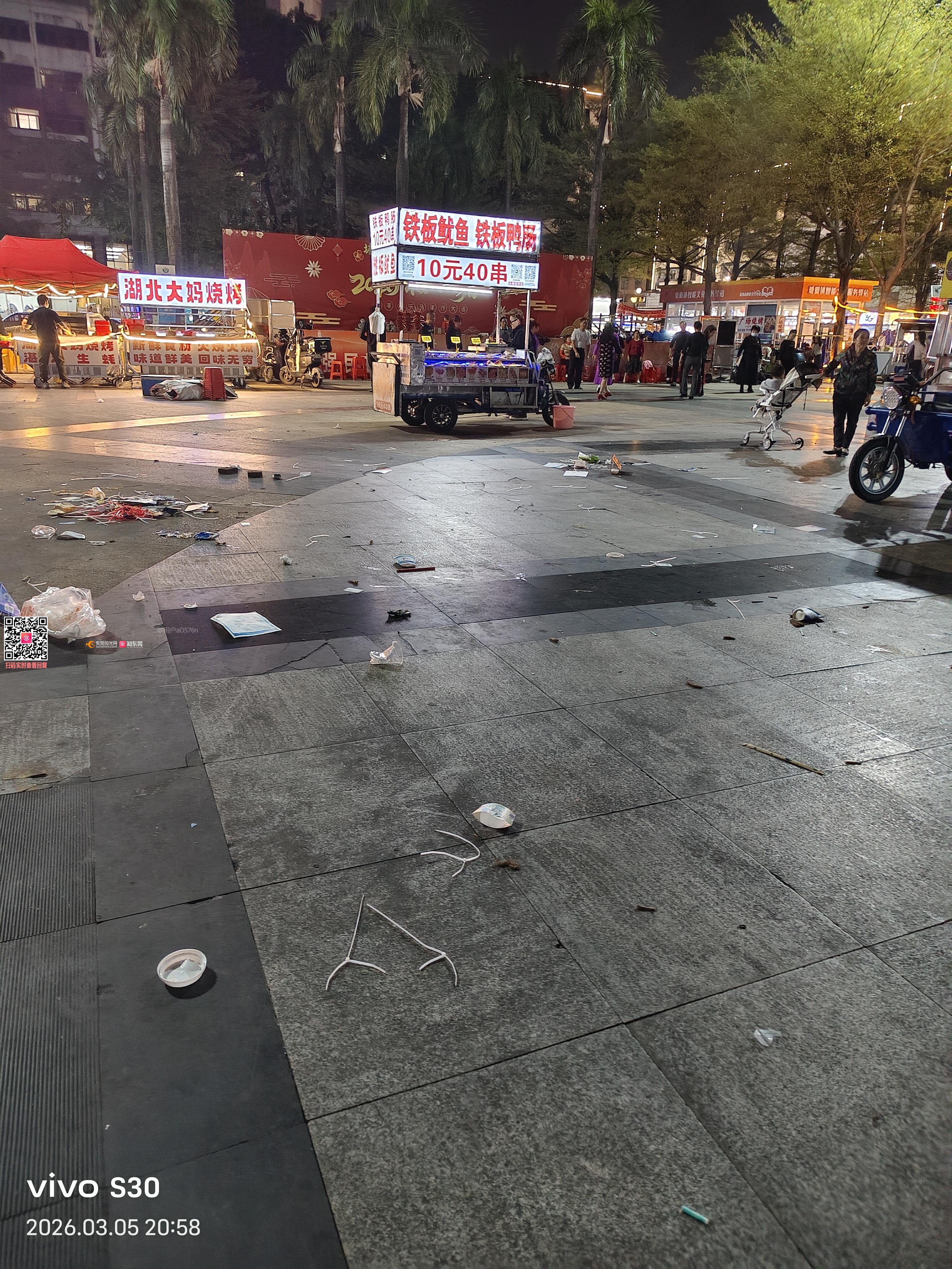 正是因为存在“收费关系”,城管部门对夜市的日常管理形同虚设,甚至刻意纵容, 1. 油烟直排: 交了费的烧烤、油炸摊贩被允许在没有任何油烟净化设施的情况下经营。每日傍晚至凌晨,整条街道笼罩在刺鼻油烟中,周边居民无法开窗通风,身体健康受到严重威胁。 2. 噪音与垃圾污染: 收费后,城管对摊贩超时经营(直至凌晨)、高音喇叭叫卖、食客喧哗等行为视而不见。地面油污厚重、垃圾遍地,公共广场变成“垃圾场”,严重违反《中华人民共和国噪声污染防治法》和市容管理规定。