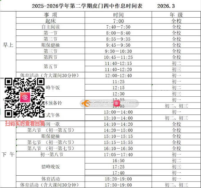 虎门四中公众号发布的时间表与学校实际的并不同,要求学生7点到班而不是七点起床,初一也要求学生吃完午饭后回到班上自习,初三学生十二点三十才下课,一点钟就要午休,这些安排都不符合学生正常休息需要。希望学校能够明白这样压榨学生并不能让领导政绩有所提高。