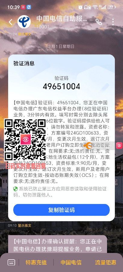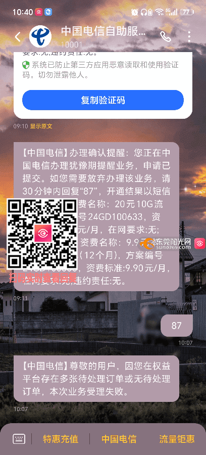 本年3月2日因小学生家长群内有投票,本人用本手机点进去后发现需要填写电话号码(只有一个小对话框,内有“填写电话号码”和一个输入框)填完后再出现的是要填验证码,同时要点免责条款,我发现后就认真看了一下,发现是一个9.9元的流量套餐,因本人流量一直用不完,没有这个需求,于是我就退出没管(验证码没有回填),但几分钟后收到一条业务开通的信息,同条信息还有一条发送“87”可退订的信息(收到验证码的信息只有一个9.9元的业务,可同时开通的还有一个不知道哪来的20元业务),可退订信息发过去后收到的是退订业务受理失败。于是打电话10000是投诉,结果是退订可以,但需机主本人的身份信息验证,需本机号码服务密码验证等一堆验证,业务开通的关联电话无法取消,而且己自动扣了的款不退。后来打过10001结果一样,打过几次12345,结果也一样,打02028612300这电话不管什么时候都在通话中!我现在的需求有3个,1是退订并退款,这两个诈骗业务怎么开通的,就怎么帮我取消并退款。2是下架所有该类型的业务广告,以防他们再骗其他人。3是希望能解释一下,为什么开通业务不需要验证机主信息,而主动退订需要一大堆的验证?